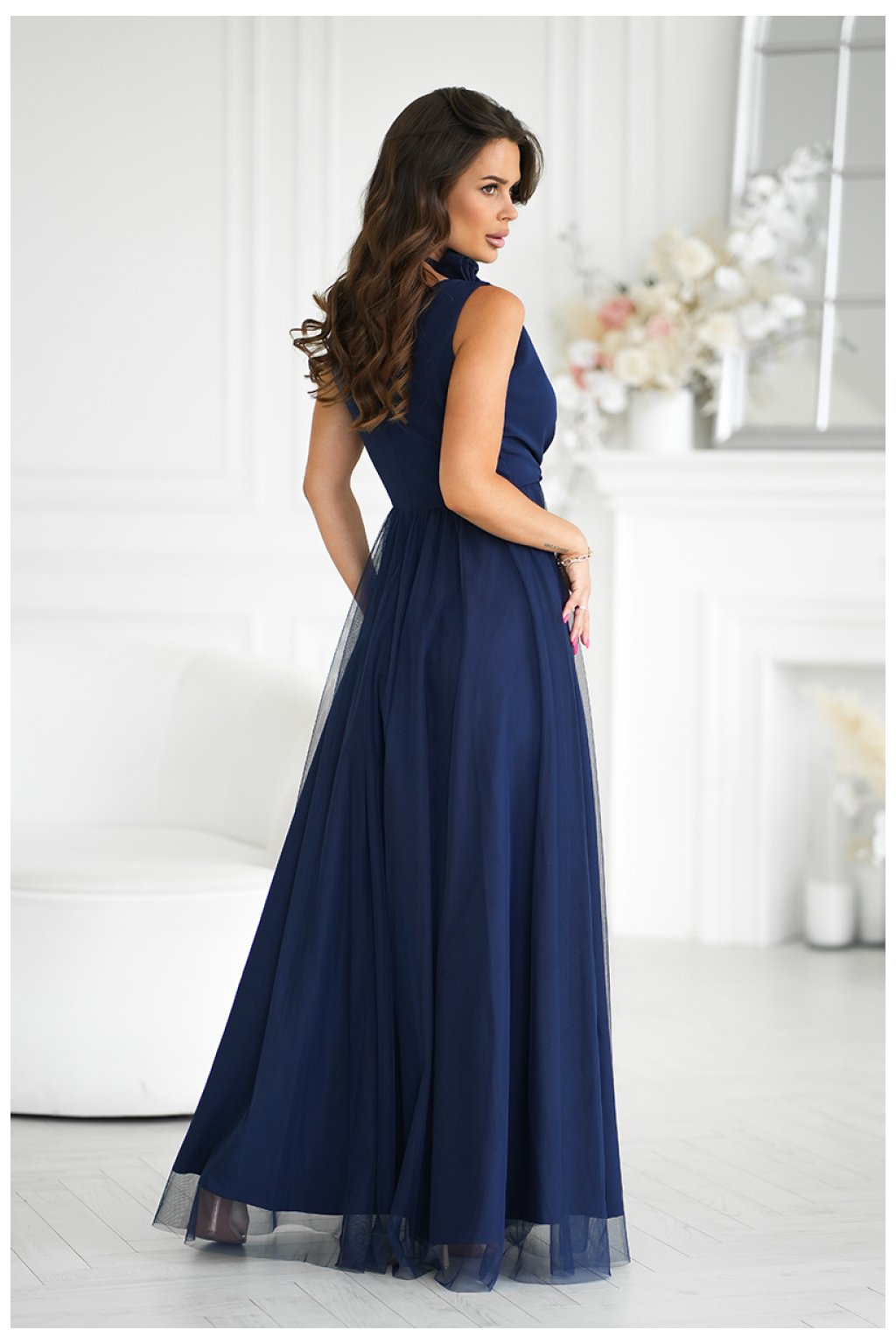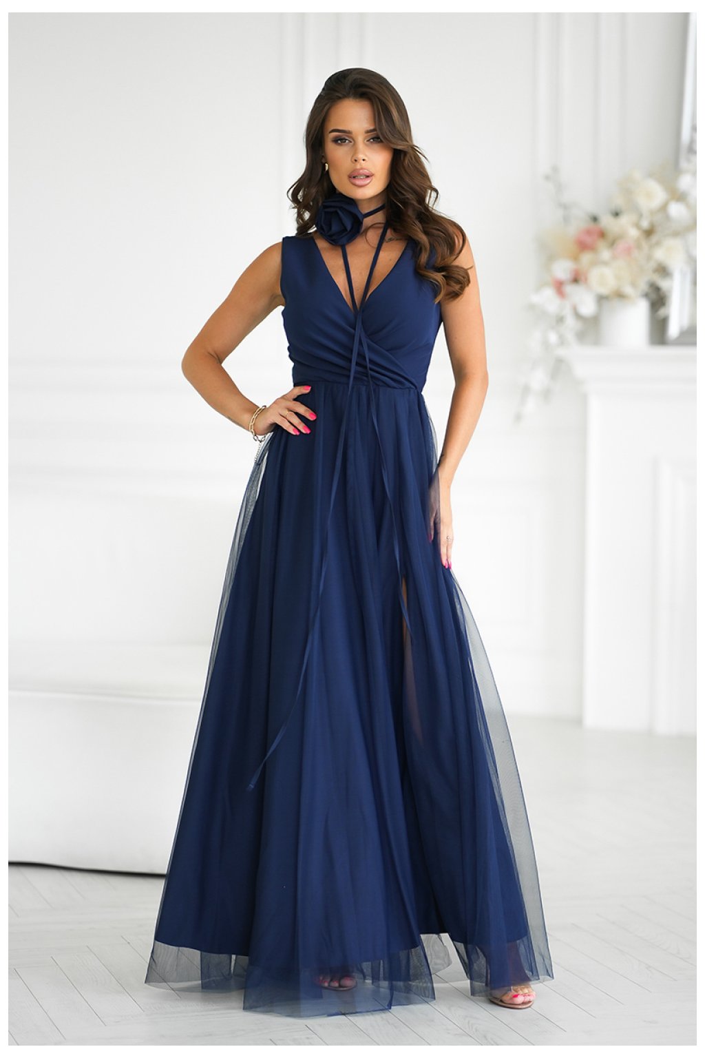 Krásné, dlouhé šaty, které okouzlují svým neobvyklým střihem. Vyrobena z lehké tkaniny, dokonale zdůrazňuje siluetu. Horní část šatů má jemný výstřih a dvojvrstvý spodek s výstřihem na noze dodává kreaci šarmu. K šatům je přiložen opasek s růží, který lze obléknout různými způsoby, jak na krk, tak na pas, což umožňuje individuální přizpůsobení stylizace.Složení: