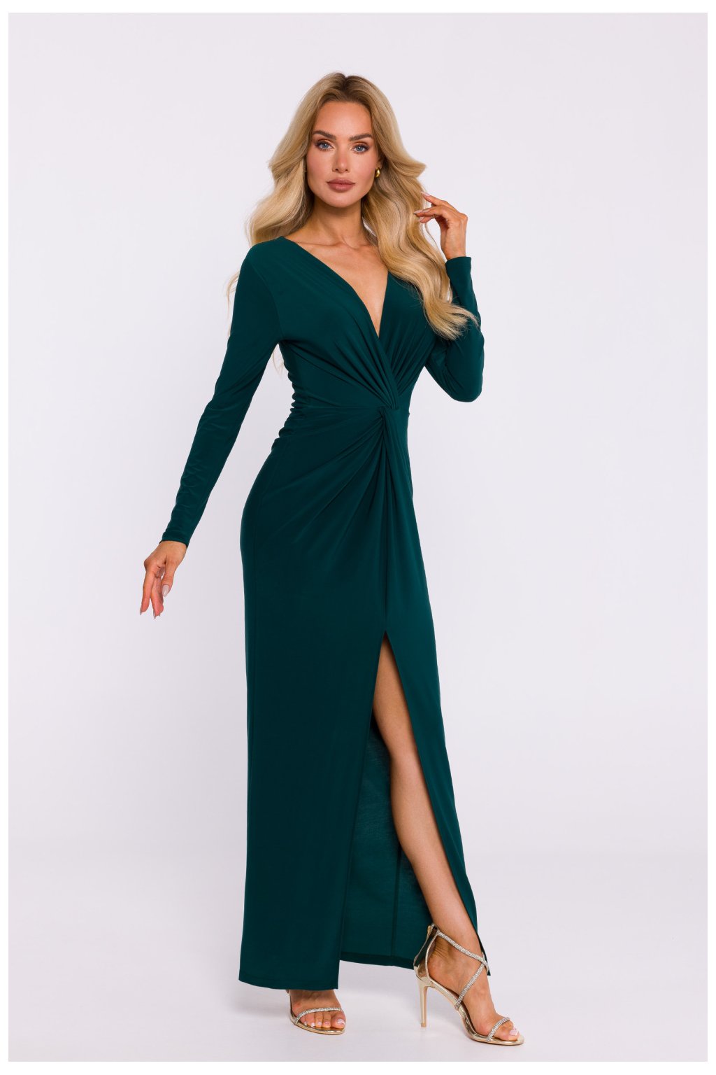 Elegantní společenské šaty z elastického úpletu, který zajišťuje pohodlí při nošení a dokonale přiléhá k postavě. Model v maxi délce s hlubokým výstřihem do V zdůrazňujícím linii poprsí. Střih je přiléhavý, s ozdobným uzlem na přední straně, který dodává stylingu jedinečný charakter, a vysokým rozparkem, který decentně odhaluje nohu. Šaty mají dlouhé rukávy a na zádech jsou modelující záhyby, které opticky zeštíhlují siluetu. Diskrétní zapínání zajišťuje skrytý zip na boku. Šaty nemají podšívku, což zdůrazňuje jejich lehkost. Výrobek navržen a ušit v Polsku.