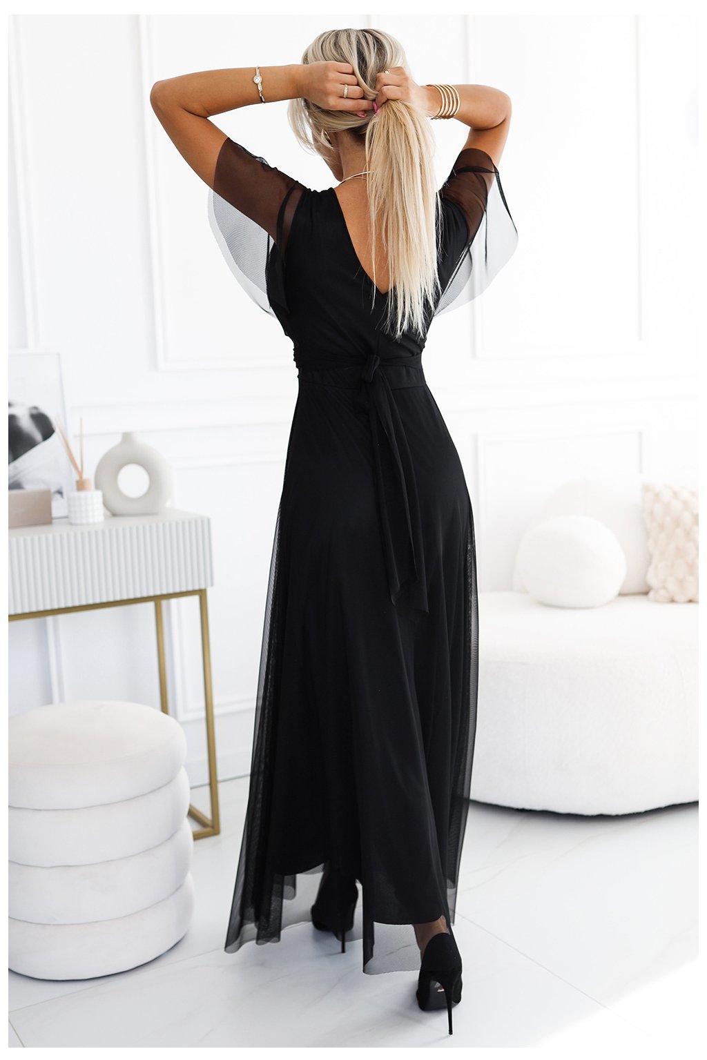 Šaty NASTIA značky Numoco Basic jsou jemnou, dlouhou kreací s výstřihem a krátkým rukávem. Jsou vyrobeny z lehkého, černého tylu, který jim dodává lehkost a vzdušnost. Šaty mají zpevněné košíčky, co zajišťuje perfektní podporu, a šněrování v pase jemně zdůrazňuje pas. Jedná se o jedinečný návrh s ženským a romantickým charakterem. Vyrábí se v Evropě a kombinuje vysokou kvalitu zpracování s elegantním designem. Ideální na večerní vycházky a speciální události.