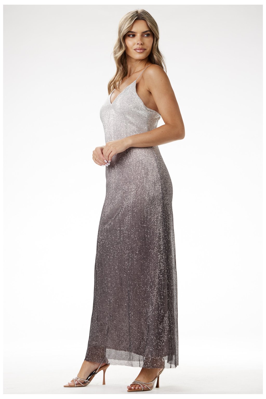 Večerní maxi šaty s flitry na ramínkách, efekt ombre. Elegantní maxi šaty na ramínkách s efektem ombre. Ideální na speciální příležitosti, jako je Silvestr, svatby nebo elegantní večírky. Střih podtrhuje postavu a jemný výstřih ve tvaru V dodává eleganci. Efekt ombre postupně přecházející od bílé po černou přitahuje pohled a dodává eleganci. Tenké ramínka a odkrytá záda zdůrazňují smyslnost. Saténová podšívka zaručuje pohodlí a luxusní vzhled, ideální na speciální události.