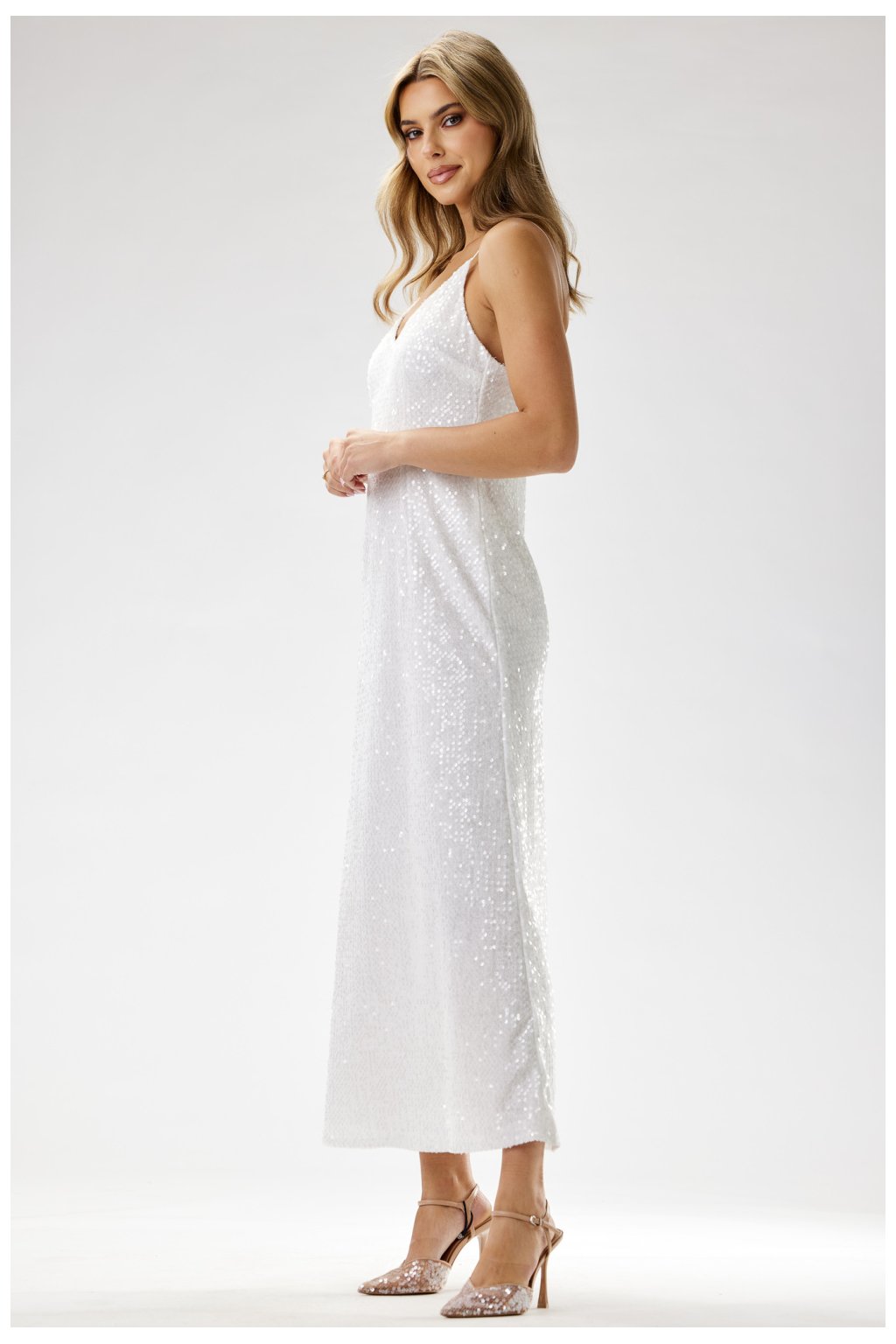 Večerní maxi šaty s flitry Očarující večerní maxi šaty z žíněného sametu s flitry, ideální na výjimečné příležitosti. Přiléhavý střih zdůrazňuje postavu, přidává eleganci a šarm. Přiléhavý střih zvýrazňuje pas a boky, přidává sebevědomí. Samet s flitry krásně září, vytváří efektní vzhled pro večerní výlety. Jemné ramínka decentně zdůrazňují ramena, přidávají smyslnost. Skrytý zip zajišťuje pohodlí při oblékání a ideální přizpůsobení. To jsou ideální šaty, které vás nechají zazářit na každé party!