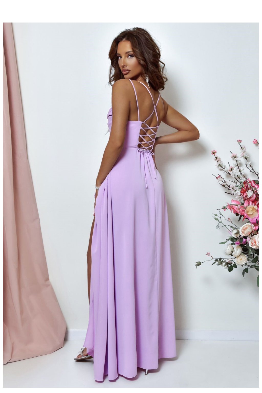 Elegatní a zároveň jednoduché dlouhé šaty s rozparkem na spodku. Šaty se zapínají na skrytý zip. Přední část s výstřihem do vody a tenkými ramínky, zadní část s pleteným vázáním. Ideální návrh na mnoho příležitostí.| Velikost | Obvod prsou | Obvod v pase |