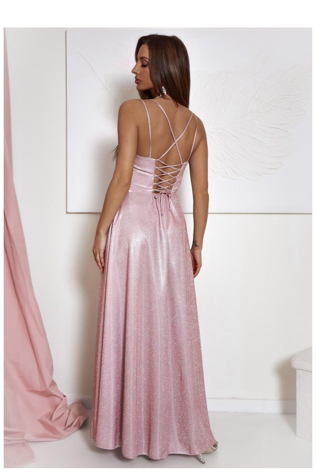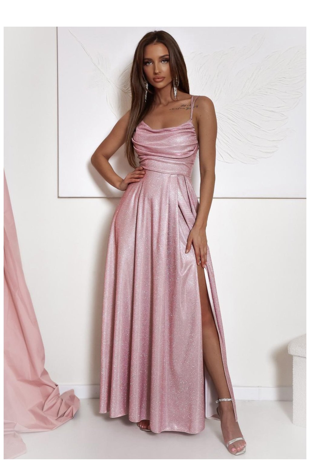 Elegantní a zároveň jednoduché dlouhé šaty s rozparkem dole, vyrobené z lesklé látky. Šaty se zapínají na skrytý zip. Přední část s vodním výstřihem a tenkými ramínky, záda s pleteným šněrováním. Ideální návrh na mnoho příležitostí.| Velikost | Obvod prsou | Obvod v pase |