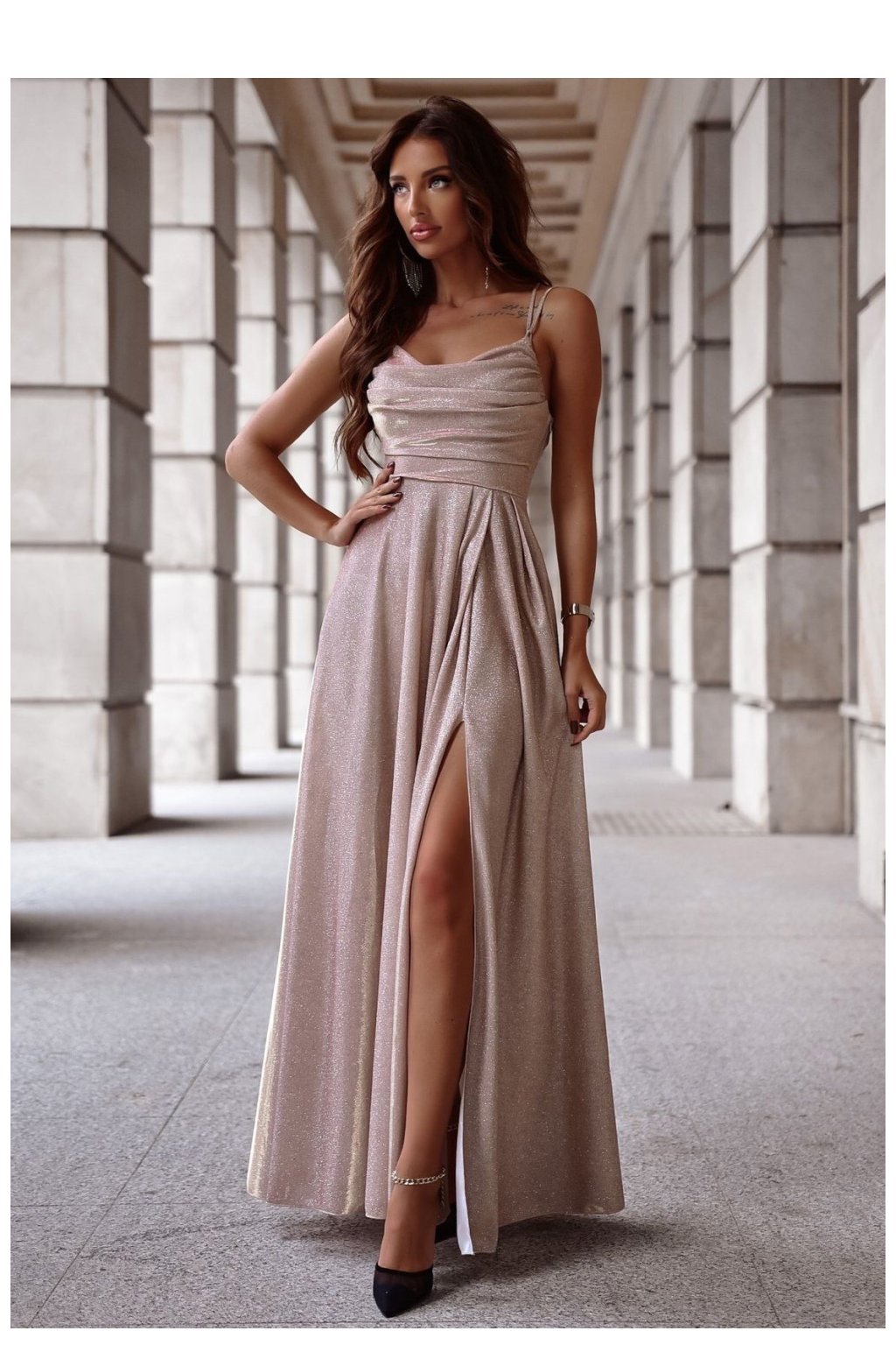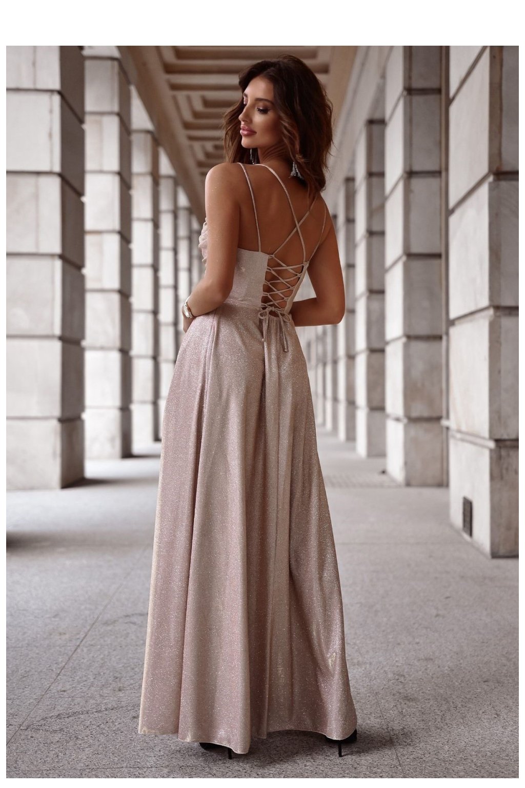 Elegantní a zároveň jednoduché dlouhé šaty s rozparkem dole, vyrobené z lesklé látky. Šaty se zapínají na skrytý zip. Přední část s výstřihem ve tvaru V a tenkými ramínky, zadní část s provázkovým zapínáním. Skvělý návrh na mnoho příležitostí.Velikost | Obvod prsou | Obvod v pase |