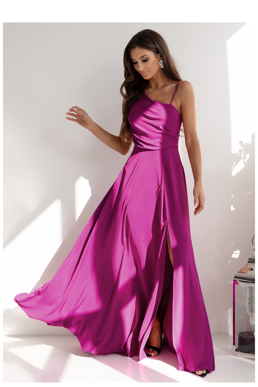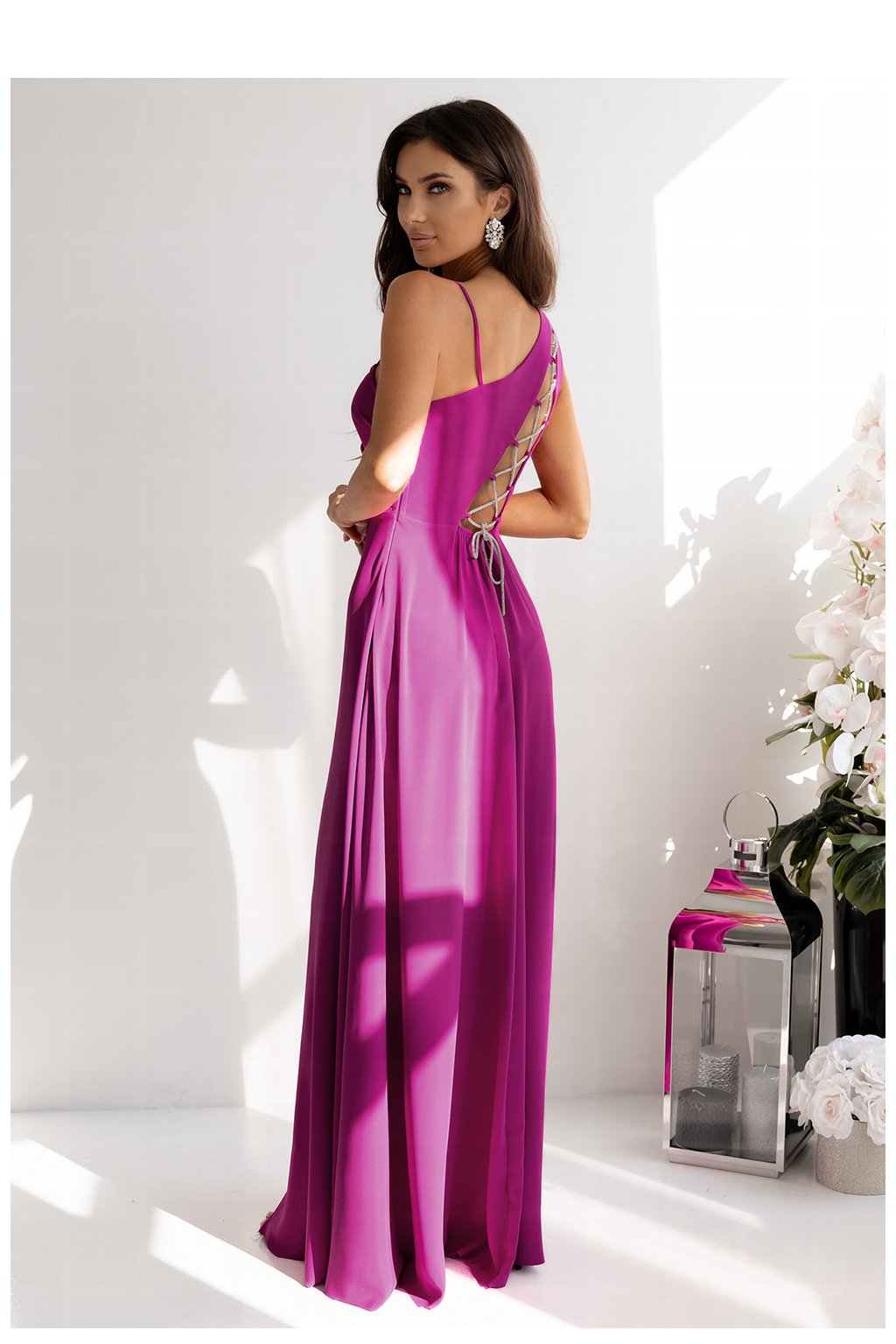 Dlouhé rovné šaty s asymetrickými ramínky, jedno tenké, druhé silnější. Šaty seříznuté v pasu, spodek rozšířený. Šaty se zapínají na skrytý zip po straně. Na zádech ozdobné prořezání s pleteným šněrováním.| Velikost | Obvod prsou | Obvod v pase |