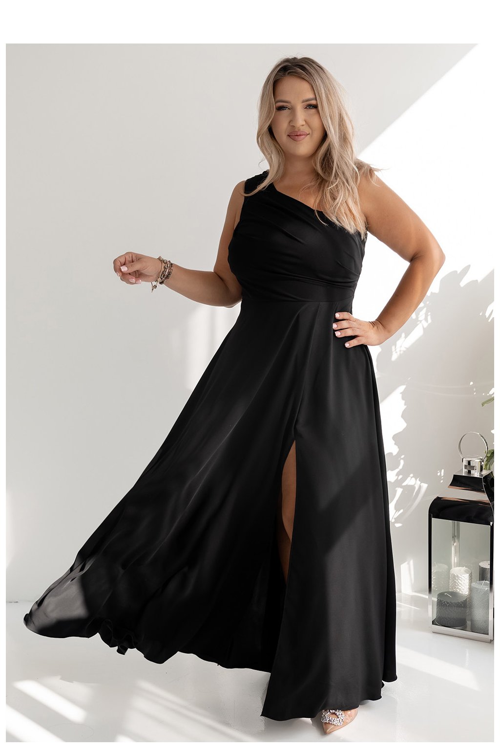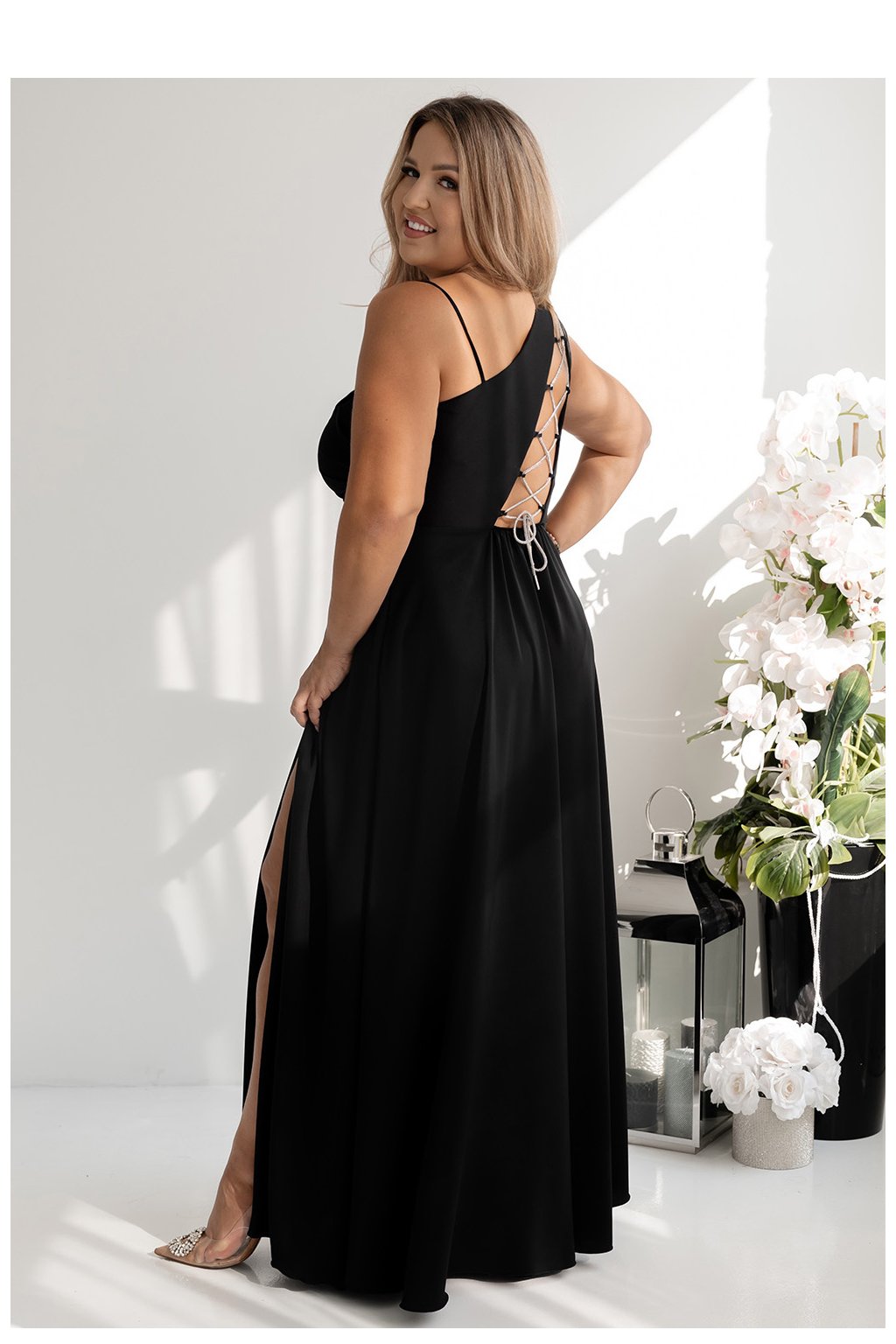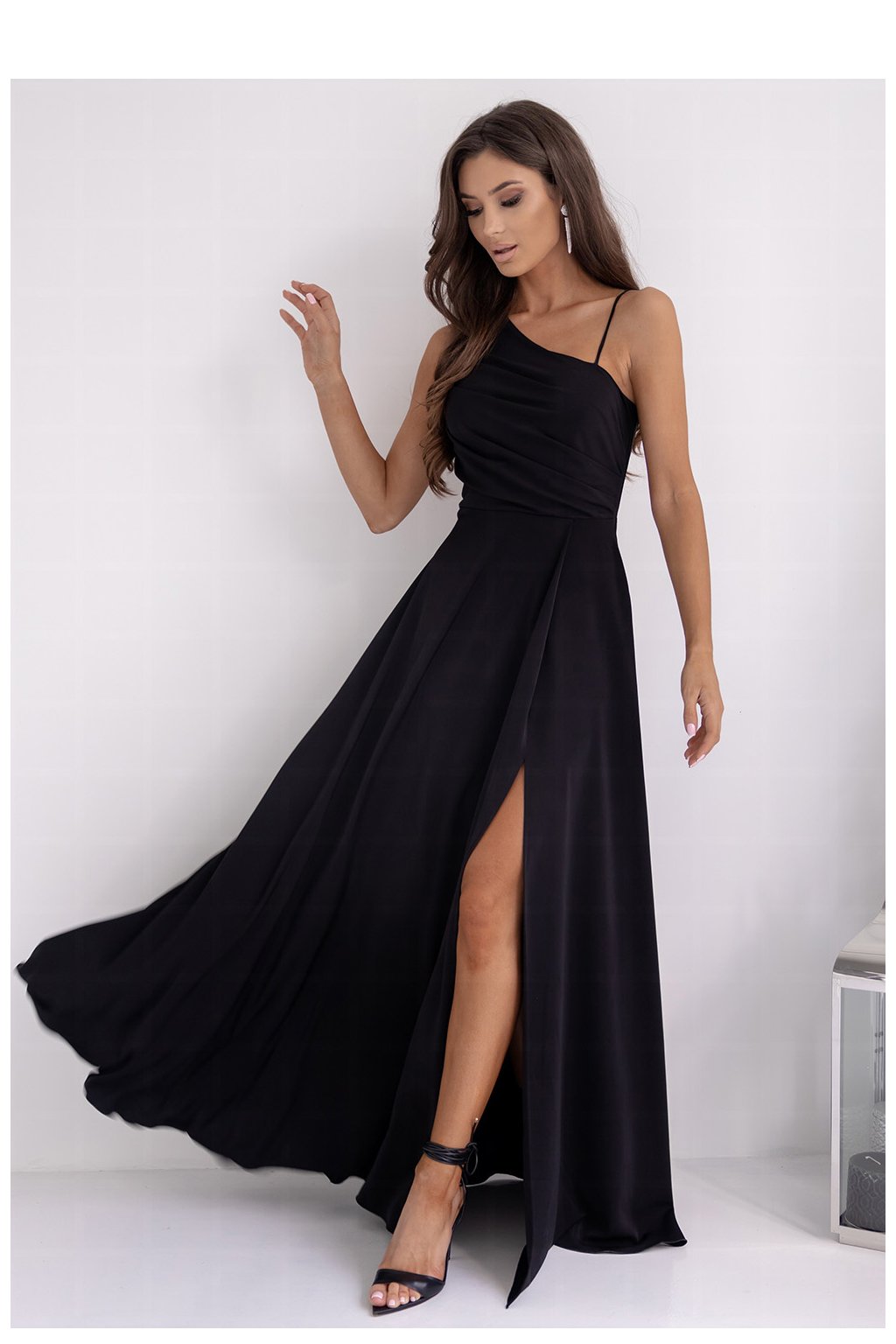 Dlouhé rovné šaty s asymetrickými ramínky, jedno tenké, druhé tlustší. Šaty se odřezávají v pasu, spodek je rozkročený. Šaty se zapínají na skrytý zip na boku. Na zádech ozdobné rozříznutí s pleteným vázáním.| Velikost | Obvod prsou | Obvod v pase |