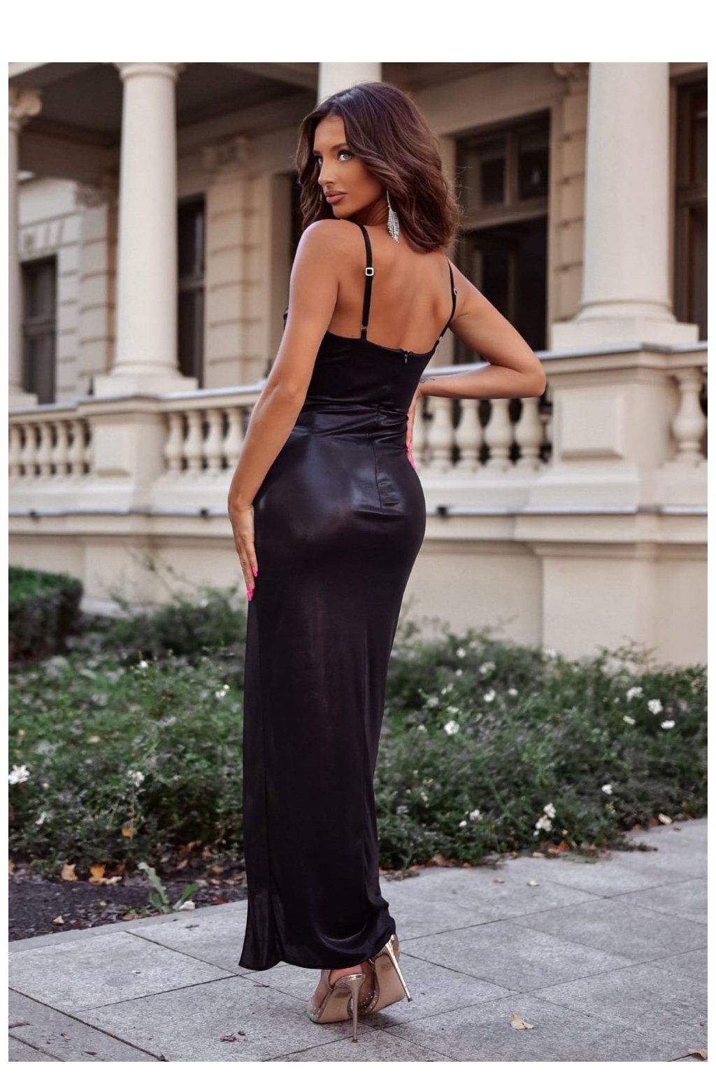 Dlouhé šaty s přiléhavým střihem na tenkých nastavitelných ramínkách. Šaty se zapínají skrytým zipem. Horní část s výstřihem, spodek s rozparkem.