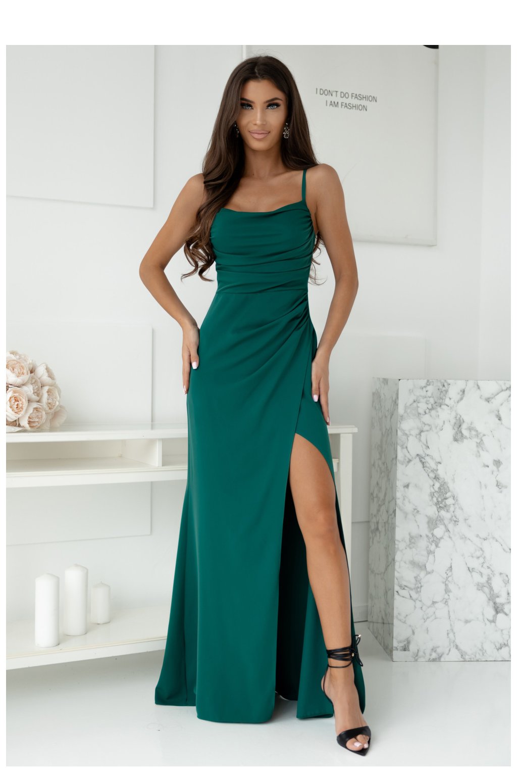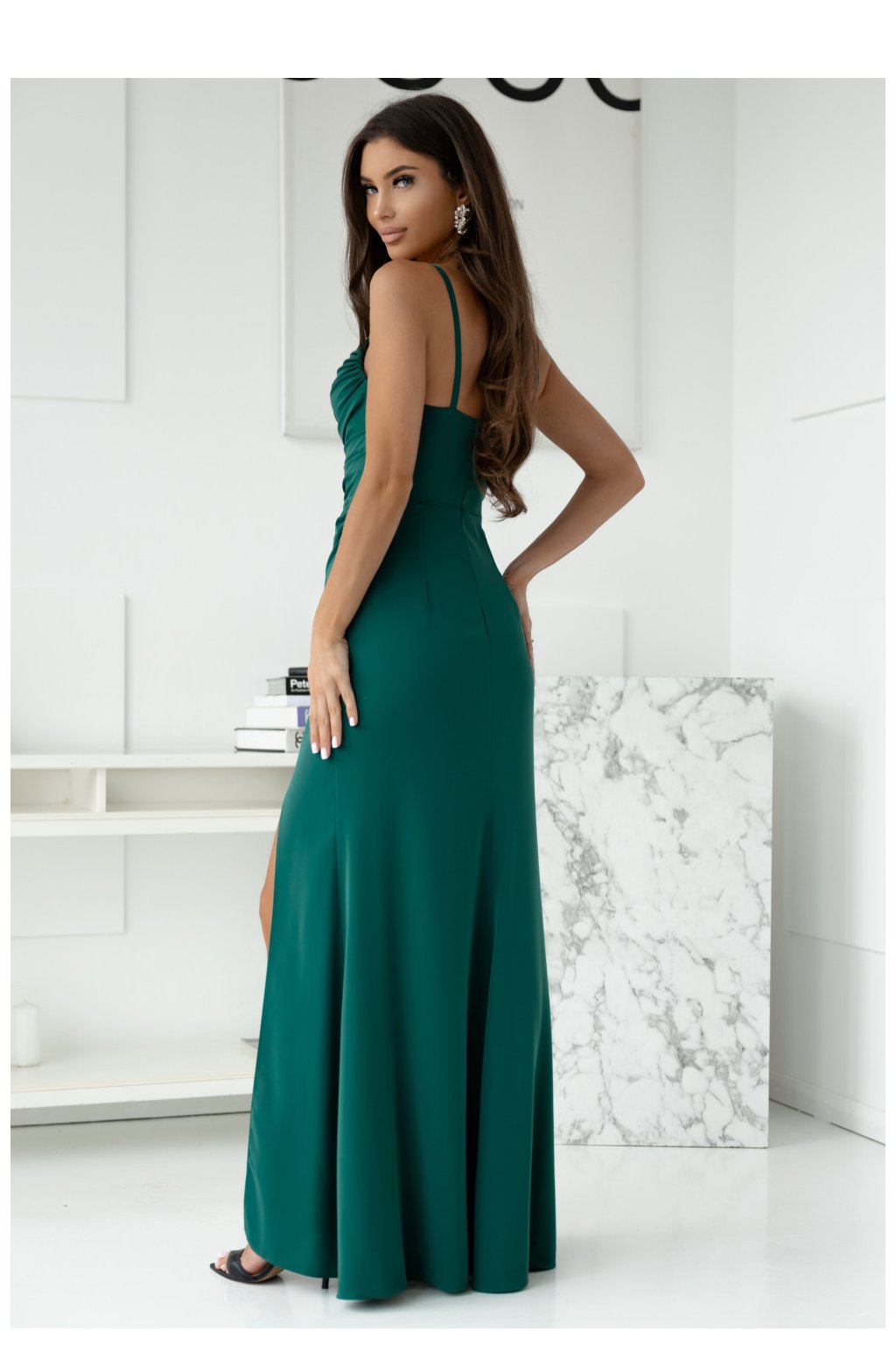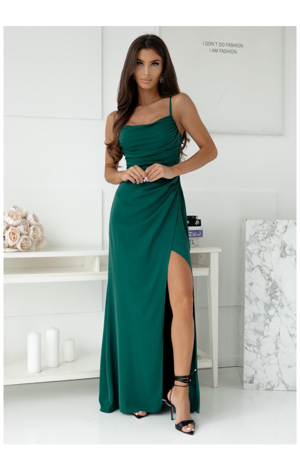 Dlouhé šaty s přiléhavým střihem a nastavitelnými ramínky, zapínající se na skrytý zip. Hluboký výstřih, spodek s dlouhým rozparkem. Ideální volba na mnoho příležitostí.