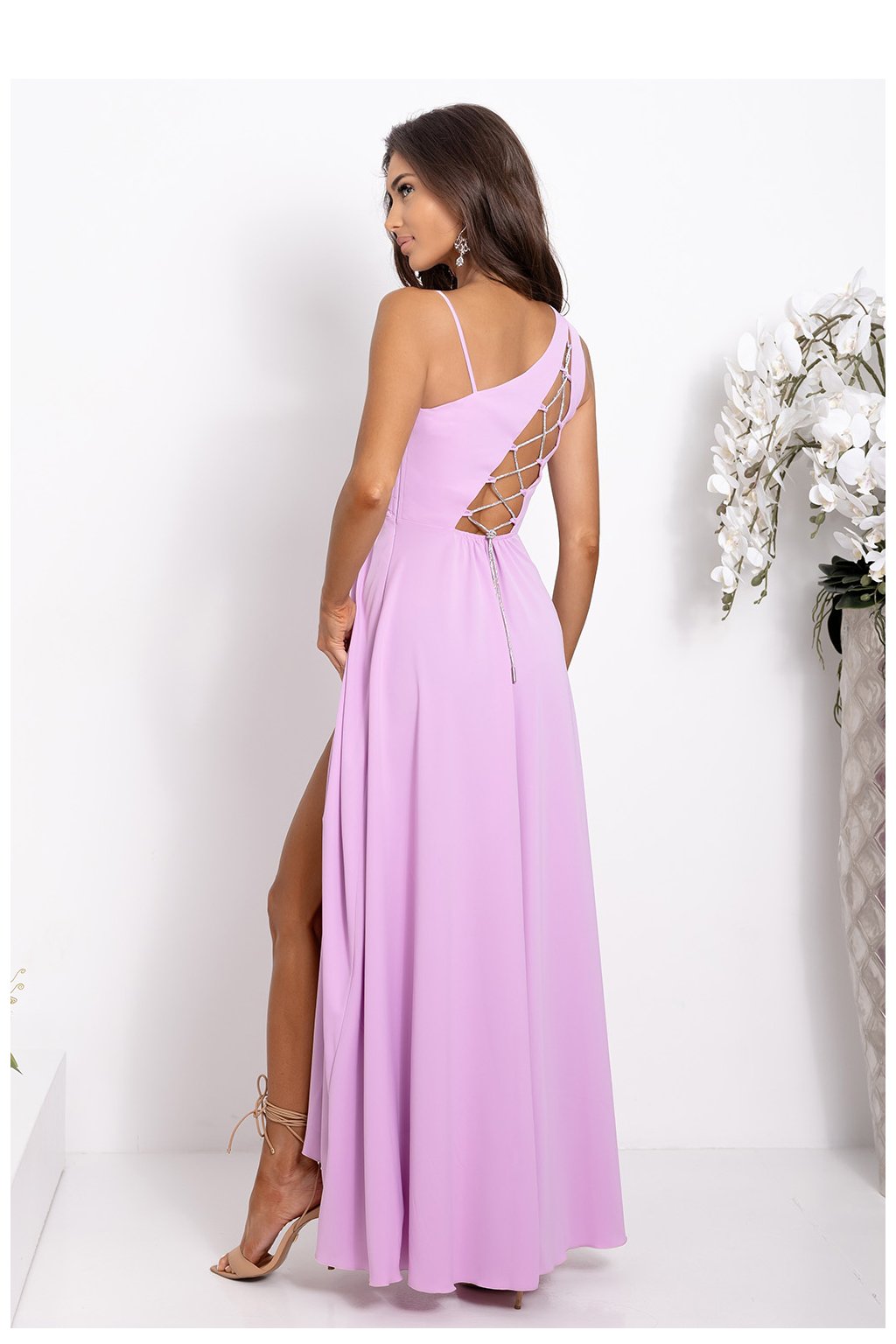 Dlouhé rovné šaty s asymetrickými ramínky, jedno tenké, druhé tlustší. Šaty se odřezávají v pasu, spodek se rozšiřuje. Šaty se zapínají na skrytý zip po straně. Na zádech ozdobné rozřezání s pleteným vázáním.| Velikost | Obvod prsou | Obvod v pase |