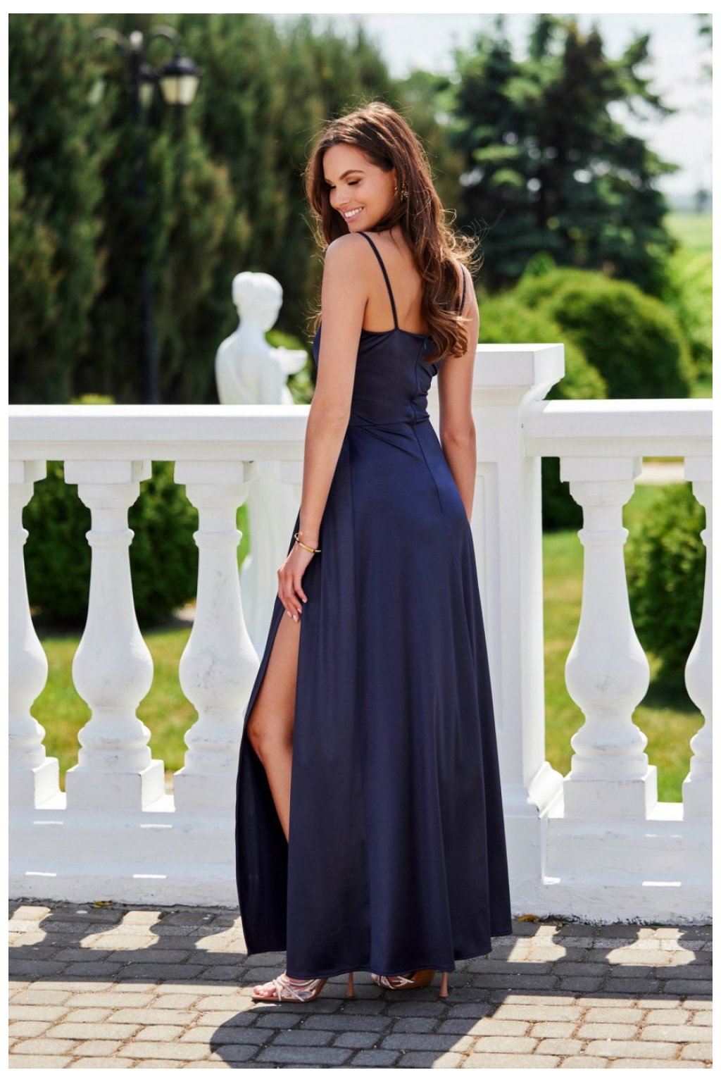 Dlouhé šaty Salma vyrobené z měkké saténové látky zaručují elegantní a důstojný vzhled a neuvěřitelný komfort nošení. Drapovaný límec na překrytí dokonale zdůrazňuje ženské tvary a dodává nonšalanci. Tenká ramínka klasicky spojená se zády šatů zajistí dobré podpěrné a výjimečný komfort nošení, svůdně odhalující ramena. Zapíná se vzadu na skrytý zip. Jemně rozkrojený střih šatů byl obohacen o sexy rozpark na nohu, který přidává dravost. Šaty Salma jsou univerzální a klasický střih šatů, který se hodí na všechny druhy slavností, jako jsou plesy, svatby, firemní večírky, Silvestr.