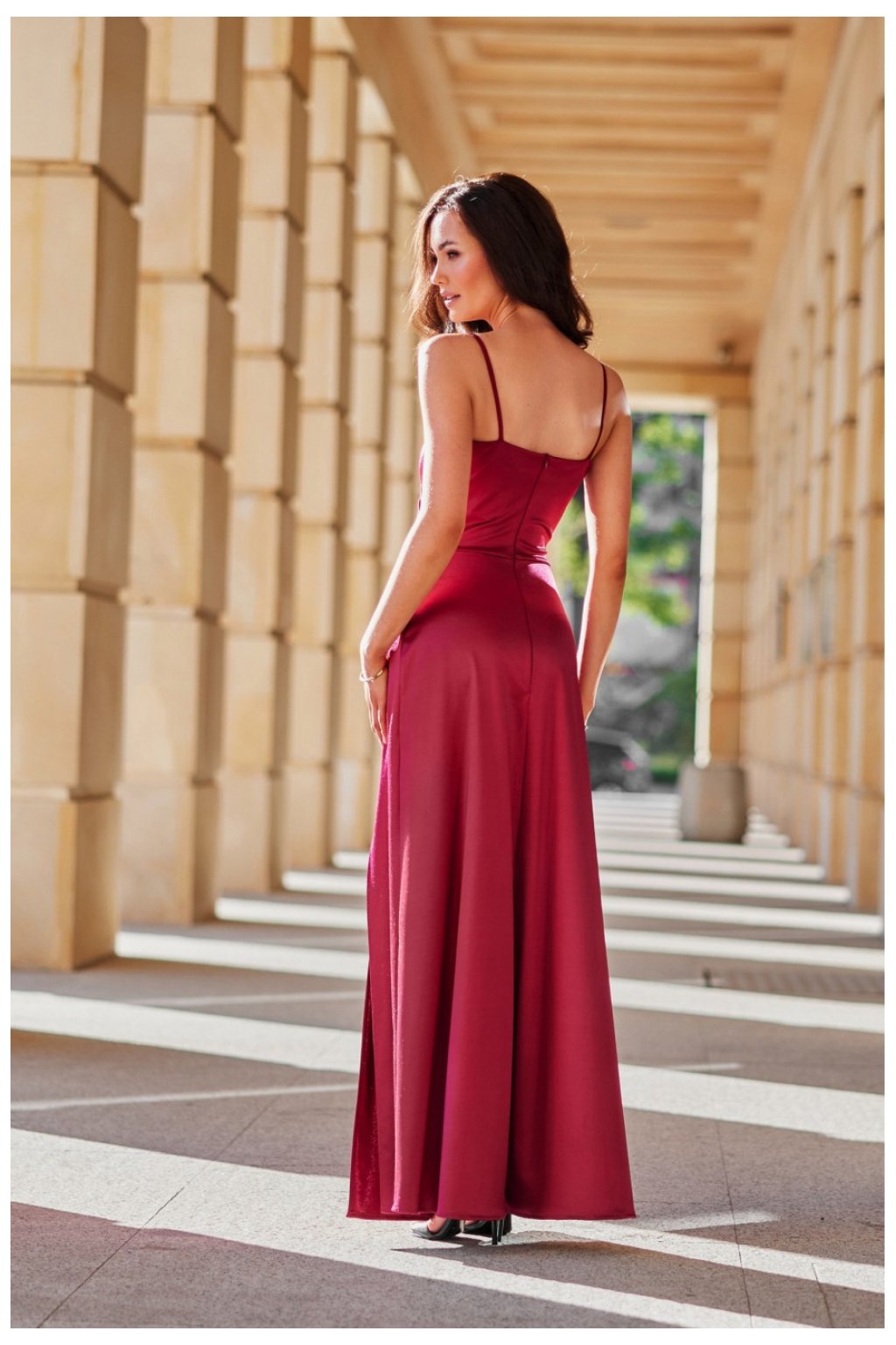 Dlouhé šaty Salma vyrobené z měkké saténové látky zaručují elegantní a důstojný vzhled a neuvěřitelný komfort při nošení. Zkosený límeček na překlopení skvěle zdůrazňuje ženské tvary a přidává nonšalanci. Tenká ramínka klasicky spojená s zadní částí šatů zajistí dobré podpětí a jedinečný komfort nošení, svůdně odhalují ramena. Zapínání na zádech na skrytý zip. Jemně rozšířený střih šatů je obohacen o sexy rozpark na nohu, který přidává dravost. Šaty Salma jsou univerzální a klasický střih šatů, který se hodí na všechny druhy slavností, jako jsou: ples, svatba, firemní večírek, Silvestr.