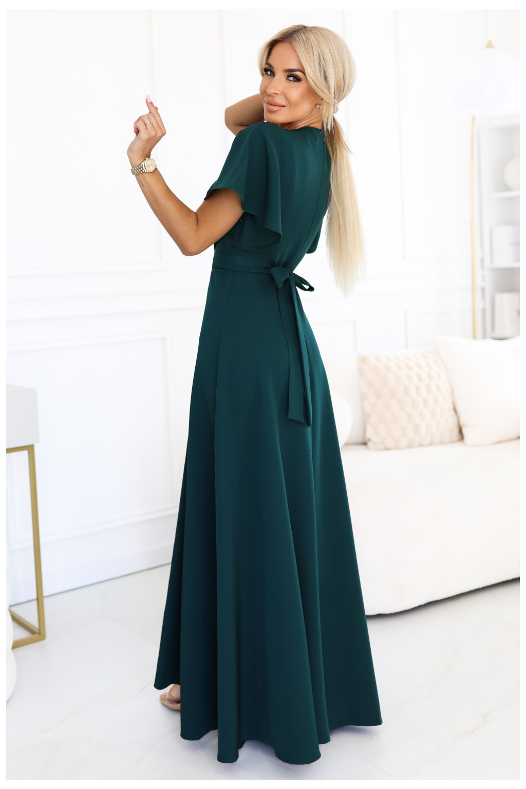 Šaty Jennifer od značky Numoco spojují eleganci a pohodlí v jednom. Maxi model s efektním záhybovým výstřihem krásně zdůrazňuje poprsí a zúží siluetu, zatímco široké, volné rukávy dodávají kreaci lehkost. Vysoké rozparky na noze přidávají smyslný charakter a zdůrazňují ženský půvab. Vyrobené z vysoké kvality materiálu, šaty se dokonale přizpůsobí tělu a zajistí pohodlí během večerních událostí. Hluboká zelená barva dodává šatům nadčasový styl, který se hodí na svatbu, ples, Silvestra, banket, galavečer nebo romantickou večeři.