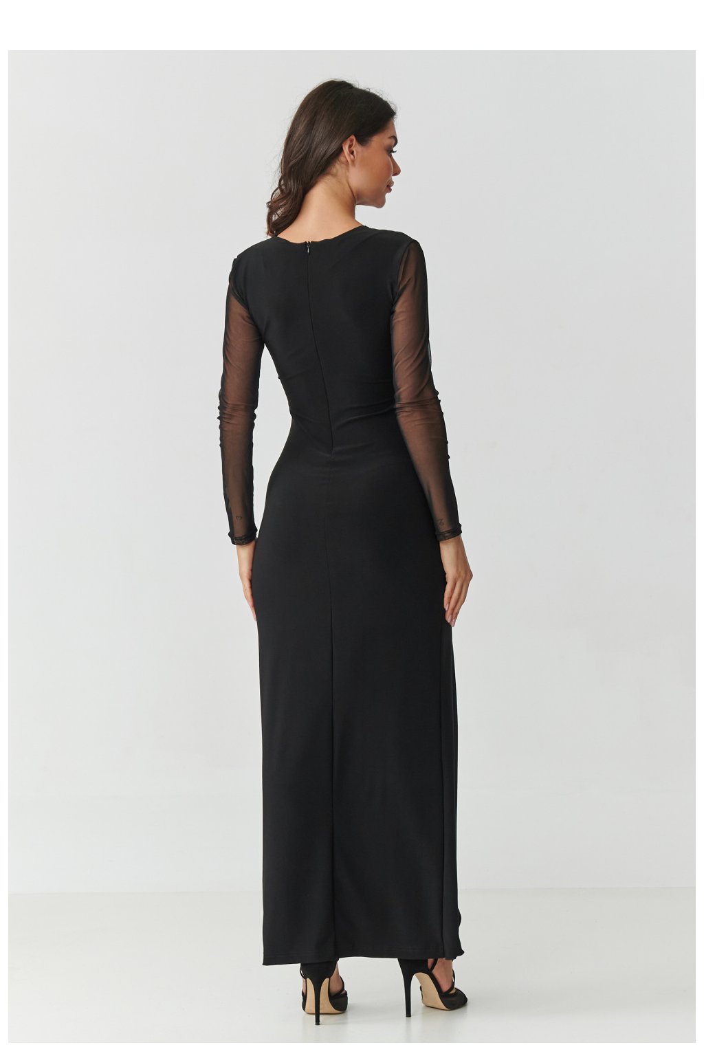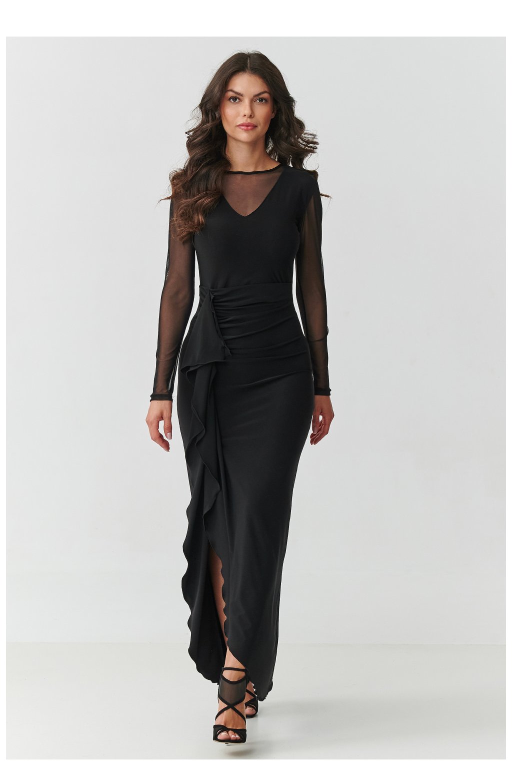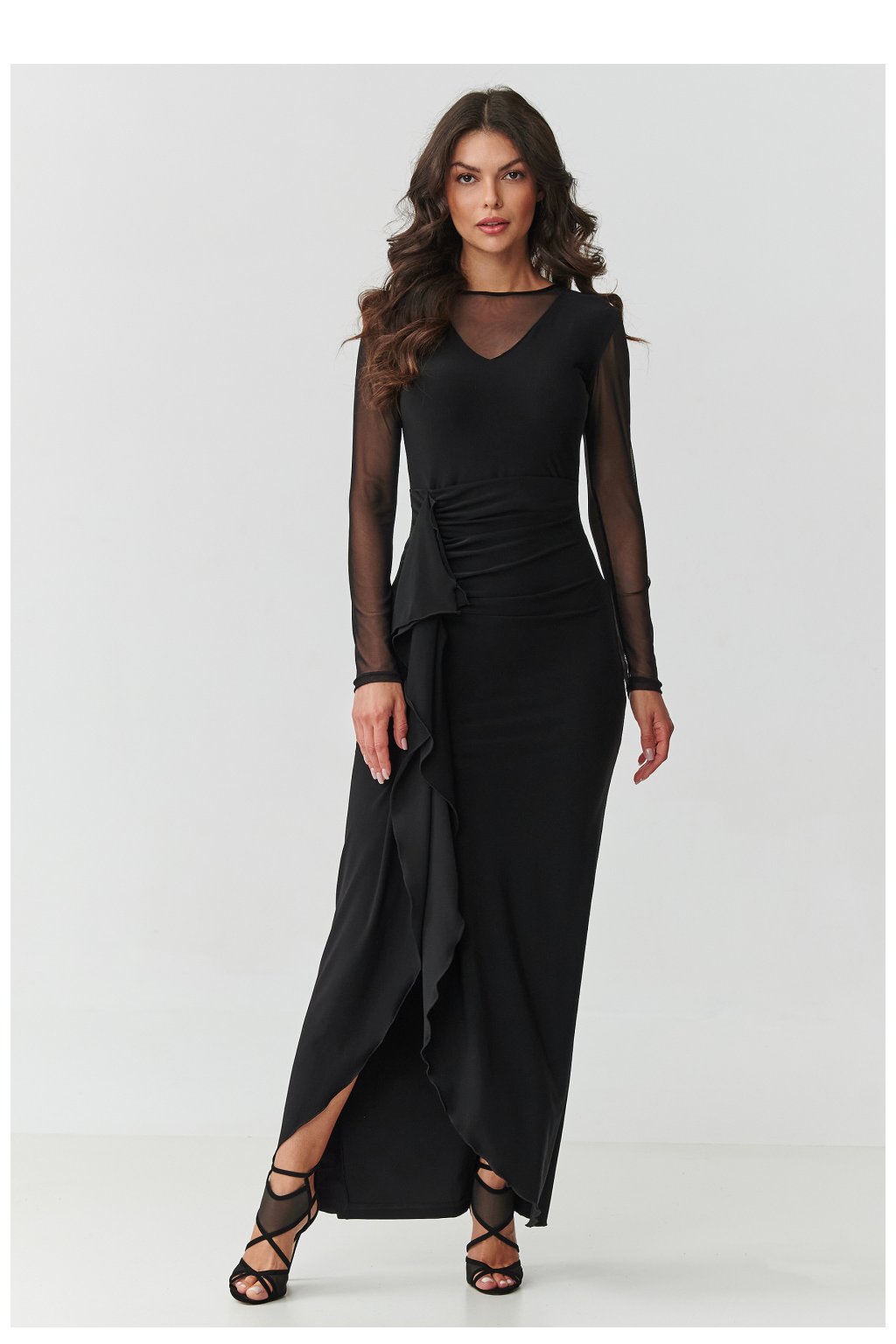 Tato jedinečná černá maxi šaty jsou kvintesencí elegance a ženskosti. Jejich délka až na zem zajišťuje, že vypadají velmi důstojně a skvěle vypadají při večerních akcích, přidávají postavě štíhlost a lehkost. Výstřih ve formě jemného písmene V, obklopený jemným tylem, krásně zdůrazňuje krk a klíční kosti, zůstávaje přitom plný elegance. Jedná se o detail, který přitahuje pohledy a zároveň zůstává smyslný a elegantní. Vhodný střih krásně zdůrazňuje pas. Efektní volán podél sukne dodává kreaci dynamiku a jedinečný charakter, a rozpark na přední straně jemně odhaluje nohu, činíce každý krok plným elegance. Model má dlouhé rukávy vyrobené z tylu, který zdůrazňuje lehkost a tajemnost celého stylu. Šaty se zapínají na zip vzadu, což usnadňuje oblékání a zajišťuje ideální přizpůsobení a pohodlí při nošení. Jedná se o kreaci vytvořenou pro zvláštní příležitosti - svatbu, ples, maturitní ples nebo elegantní večeři, kde chcete působit sebejistě a okouzlujícě. Tyl: 100% polyester.