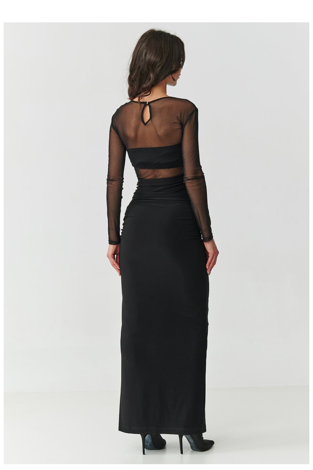 Vstupte do světa elegance, který hypnotizuje už na první pohled. Tato černá maxi šaty s síťkovaným materiálem jsou nabídkou pro ženy, které se nebojí zářit a chtějí se cítit naprosto výjimečně. Přiléhavý střih perfektně zdůrazňuje postavu, zatímco jemné záhyby v pasu formují siluetu, dodávají jí smyslnou lehkost. Průhledný vršek z jemné síťky dává šatům tajemný charakter, kde se elegance setkává s odvahou. Navíc pod tylem je samostatný top, který můžete použít i k jiným stylizacím. Smyslný rozpark odkrývá nohu s každým krokem, přidávající celku ženský magnetismus. Zlatý knoflík na zádech nejen plní praktickou funkci, ale také jim dodává bižuterní charakter, krásně kontrastující s hlubokou černí materiálu. Tento jemný akcent činí šaty luxusně vypadajícími a zároveň je jedinečnými v každém detailu. To nejsou obyčejné večerní šaty, je to kreace, ve které pocítíte, že všechny pohledy jsou upřeny přímo na vás. Skvělé na svatbu, ples, maturitu nebo elegantní večeři, vždy vás odliší svým stylem a sebejistotou. Odvážné, hypnotizující, ideální pro ženu, která chce udělat ohromující dojem a zanechat za sebou nevymazatelnou vzpomínku, jako samotné šaty. Tyl: 100% polyester.