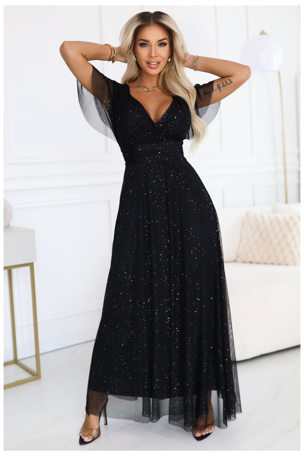 Elegantní dlouhé večerní šaty s podšívkou v černé barvě jsou návrhem značky Numoco Basic, vytvořeným s ohledem na výjimečné příležitosti. Lesklý materiál s jemným brokátovým dokončením krásně odráží světlo, přidávající kreaci jedinečný půvab. Výstřih ve tvaru písmene V decentně zdůrazňuje poprsí, zatímco lehké, vzdušné rukávy dodávají celku lehkost a eleganci. Rozkročený spodek maxi šatů dělá z kreace dokonalý tanec, zároveň zeštíhlí postavu. Je to ideální volba na svatbu, Silvestra, maturitní ples nebo elegantní banket. Vsadte na nadčasovou eleganci a vyberte si šaty, ve kterých se budete cítit výjimečně během každé slavnostní události. Evropská výroba.