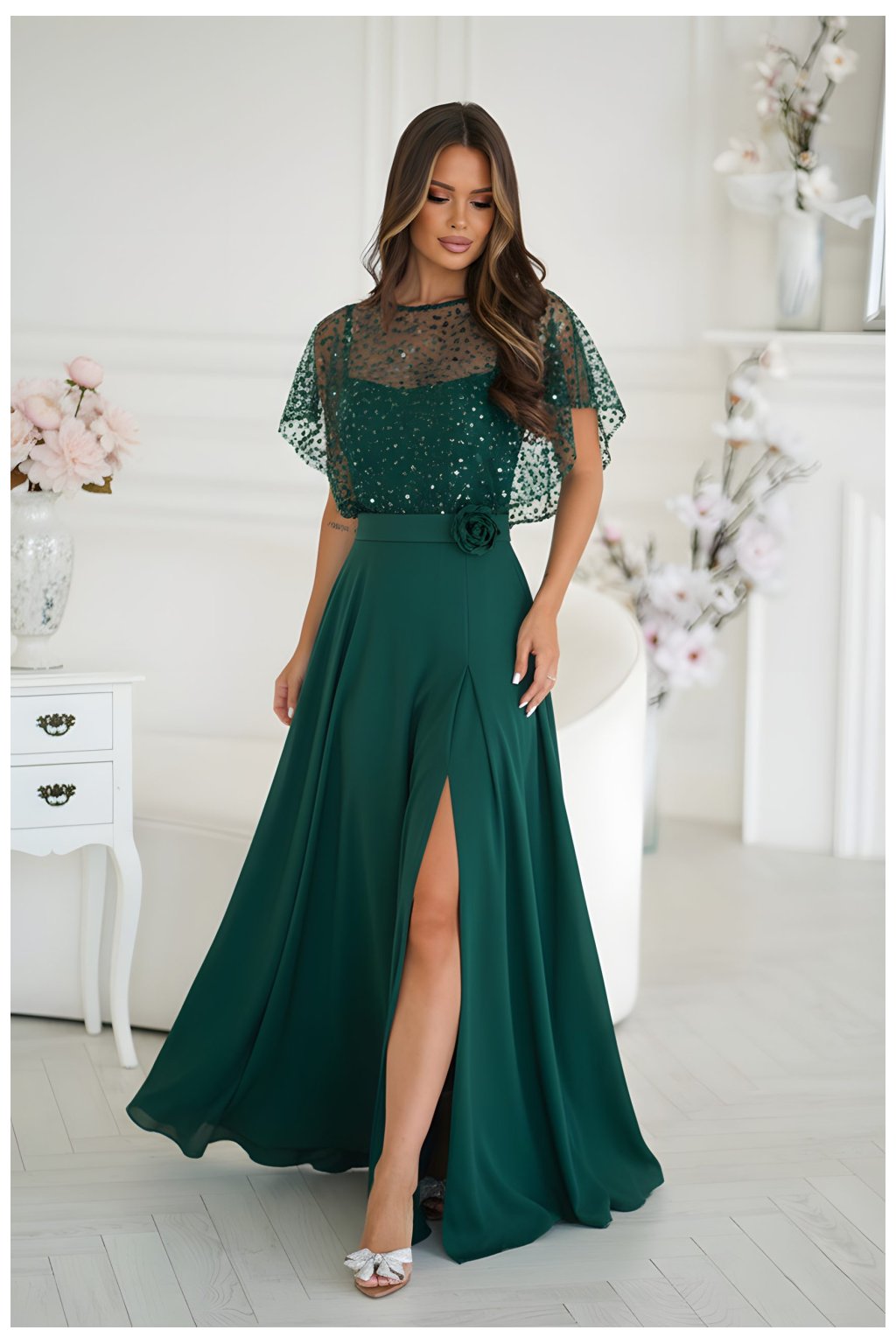 Elegantní šaty s tenkými ramínky, vyrobené z lehkého materiálu, doplněné třpytivým cekínovým bolerem s růží na pase. Lesklé dokončení dodává stylizaci eleganci a lesk, čímž se stává ideální volbou pro večerní výlety a speciální příležitosti. Šaty se zapínají na skrytý zip, co usnadňuje oblékání a svlékání kreace.