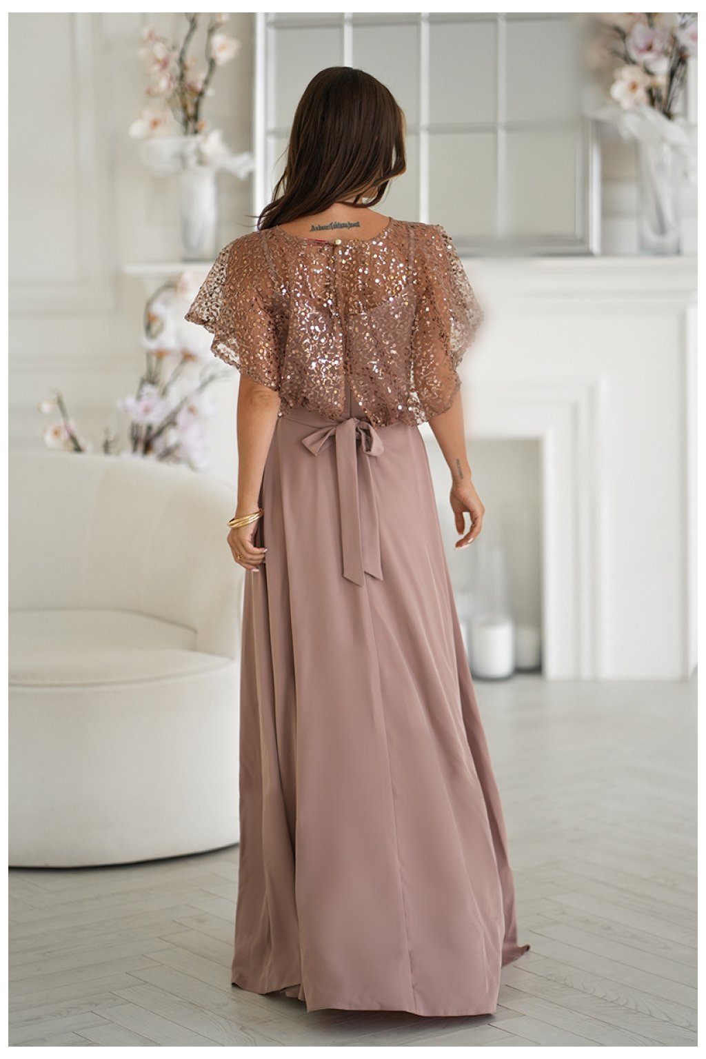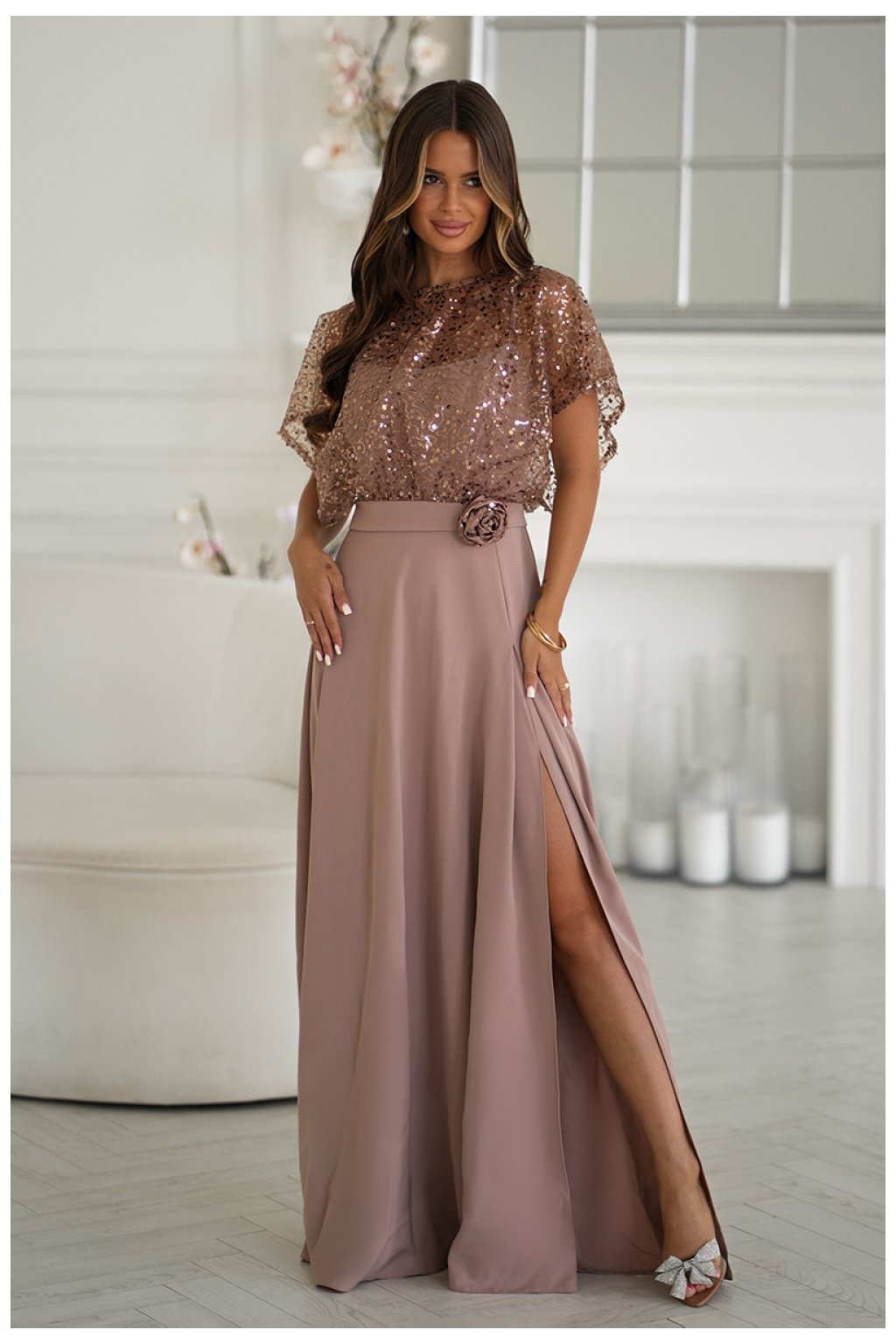 Elegantní šaty na tenkých ramínkách, vyrobené z lehkého materiálu, doplněné lesklým cekínovým bolerem s růží na pásku. Lesklé dokončení dodává stylizaci eleganci a lesk, čímž se stávají ideální volbou pro večerní výlety a speciální příležitosti. Šaty se zapínají na skrytý zip, co usnadňuje oblékání a svlékání kreace.