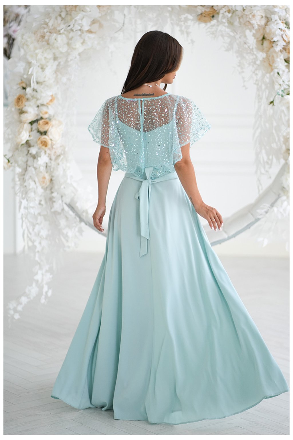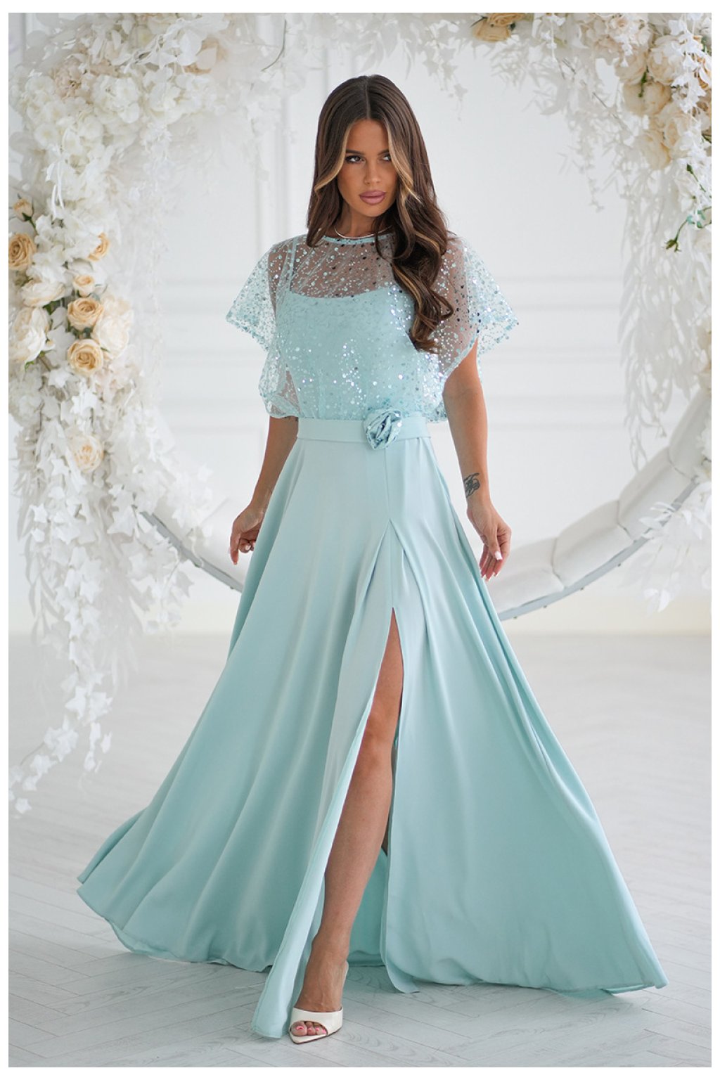 Elegantní šaty na tenkých ramínkách, vyrobené z lehkého materiálu, doplněné lesklým cekínovým bolerem s růží na pásku. Lesklé provedení dodává stylizaci eleganci a lesk, čímž se stávají ideální volbou pro večerní vycházky a speciální události. Šaty se zapínají na skrytý zip, co usnadňuje oblékání a svlékání kreace.
