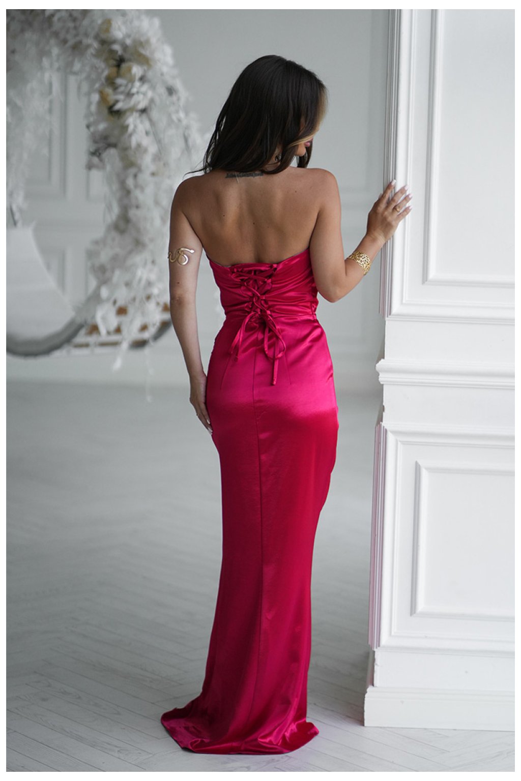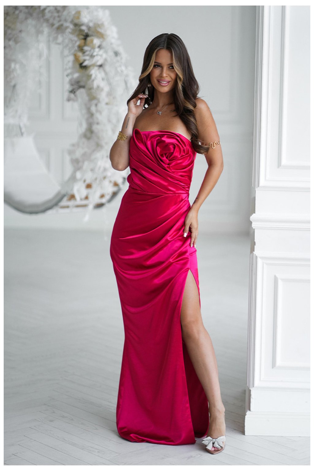Elegantní šaty z lesklého saténu, bez ramínek, zdobené velkou, drapovanou růží umístěnou na hrudi. Nahoře přiléhavý střih podtrhuje postavu, a vysoké rozparky na noze přidávají lehkosti a ženského šarmu. Ideální na speciální příležitosti a večerní výlety. Šaty se zapínají na skrytý zip, co usnadňuje oblékání a svlékání kreace.
