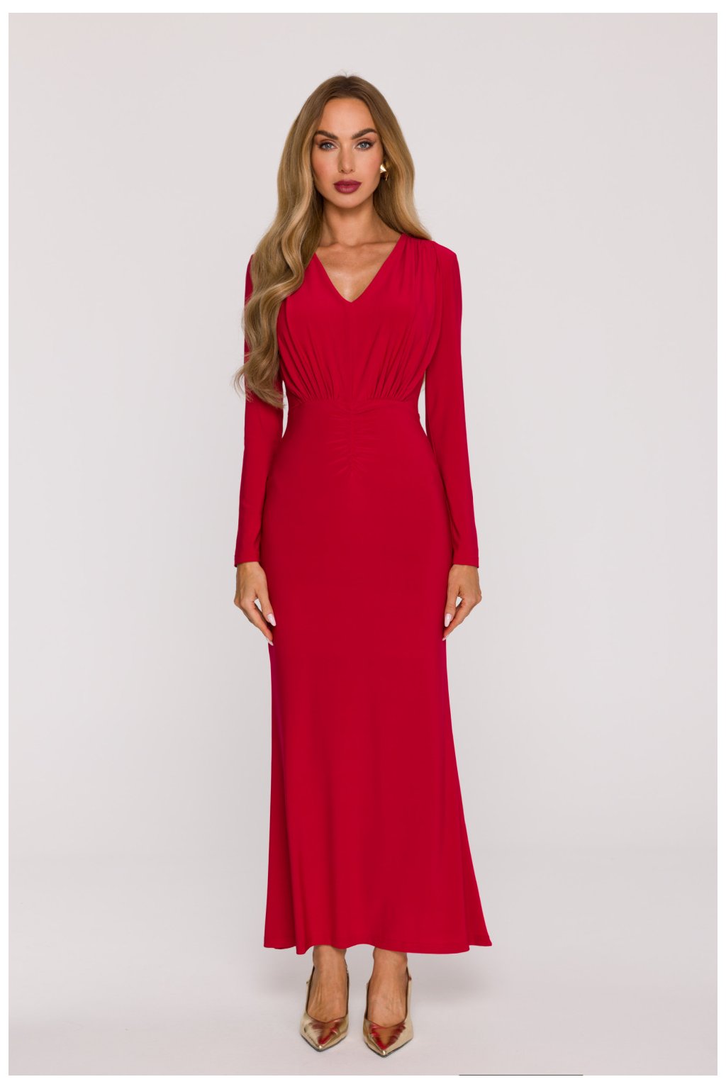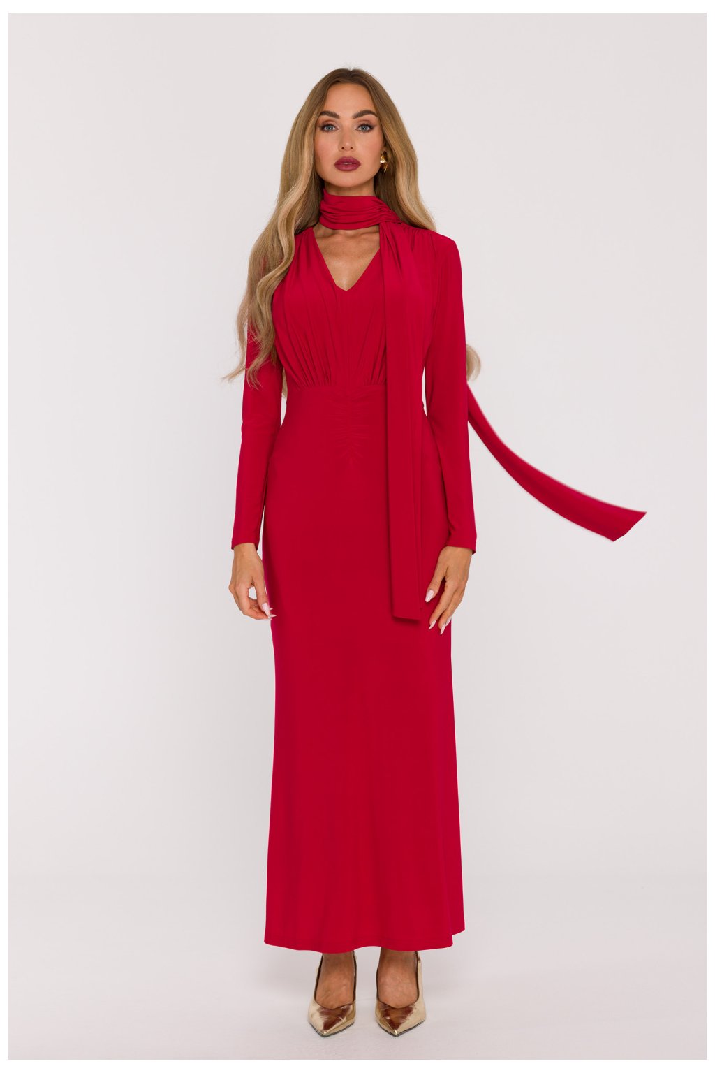 Elegantní a mimořádně ženské maxi šaty M891 vyrobené z hladké pleteniny, která okouzluje svou měkkostí, pružností a pohodlím nošení. Materiál se krásně přizpůsobuje postavě, zároveň neomezuje pohyb. Model je zdoben výstřihem ve tvaru písmene V, který jemně zdůrazňuje linii krku a dekoltu, a dlouhými přiléhavými rukávy, které dodávají celku elegantní charakter. Pas s jemným záhybem zdůrazňuje ženské tvary a dlouhé, lehce rozšiřující se dno vytváří smyslnou a štíhlou linii postavy. Další výhodou je oddělený šátek, který lze různými způsoby stylovat - uvázat kolem krku, v pasu nebo použít jako ozdobu vlasů. Šaty nemají kapsy ani podšívku, což zajišťuje jejich lehkost, a skrytý zip na boku zaručuje pohodlné oblékání a estetické provedení. Model byl navržen a ušit v Polsku s důrazem na každý detail. Jedná se o nabídku pro ženy, které oceňují minimalistickou eleganci, pohodlí a nadčasový styl.