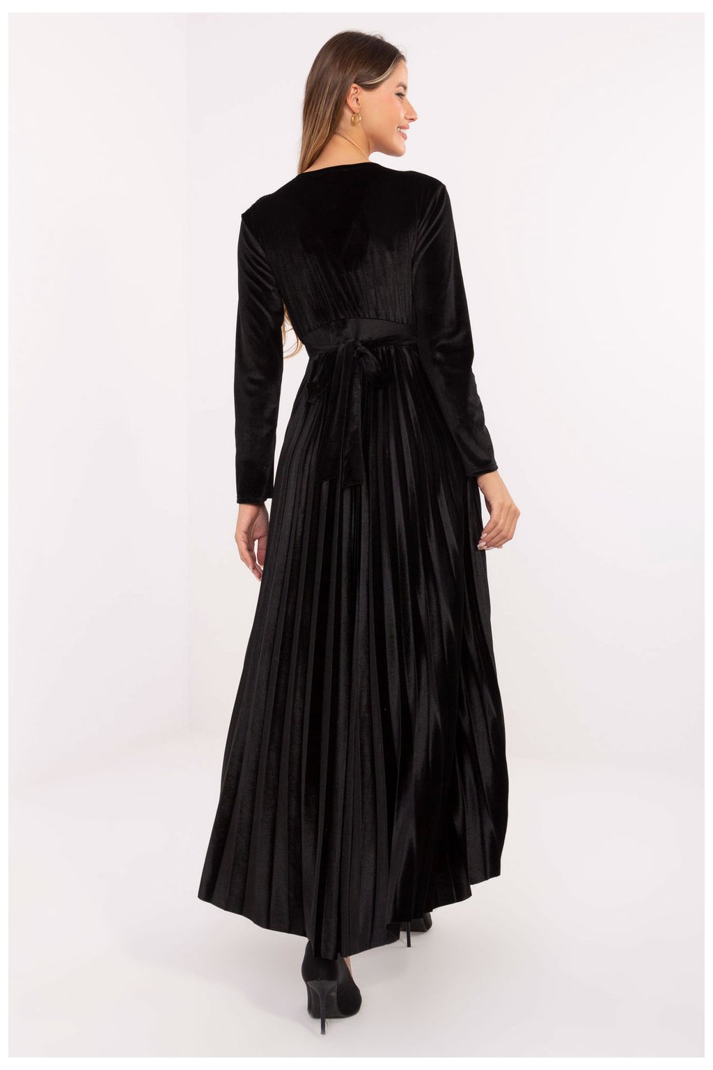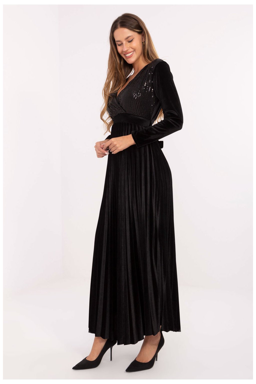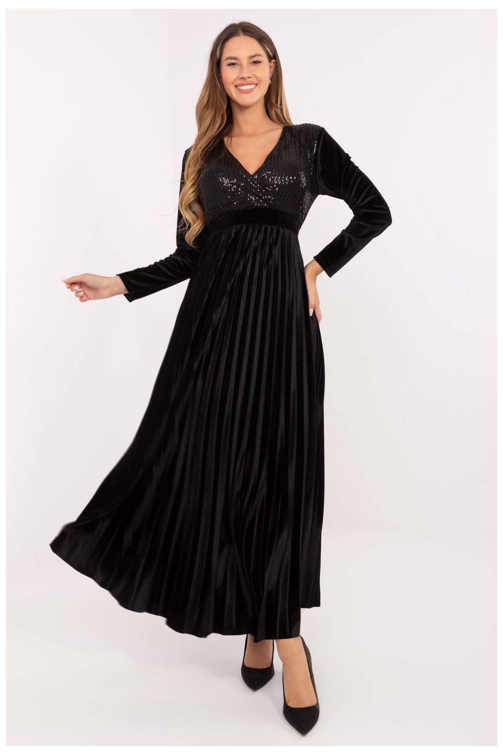 Úchvatné a elegantní dlouhé maxi šaty, které spojují ženský střih s efektními detaily, ideální na večerní události a akce. Vyrobené z lehké směsi viskózy a polyesteru, krásně padnou na postavu, poskytují pohodlí a lehkost nošení. Model má přesahující výstřih, dlouhý rukáv a výstřih pod prsy, který jemně zdůrazňuje pas. Vestavěné podsadky přidávají podporu a krásně tvarují horní část postavy. Plisovaný spodní díl dodává šatům lehkost a efektní pohyb s každým krokem. Horní část šatů je zdobena flitry vpředu, které přinášejí lesk a eleganci, a šněrování vzadu ve formě stuhky umožňuje přizpůsobit šaty postavě a zdůraznit pas. Šaty nemají klasické zapínání, nasazují se přes hlavu, což zdůrazňuje jejich volný, lehký charakter. Je to nabídka pro ženy, které oceňují eleganci, efektní detaily a pohodlí nošení, ideální na večerní výlety, akce a speciální příležitosti.