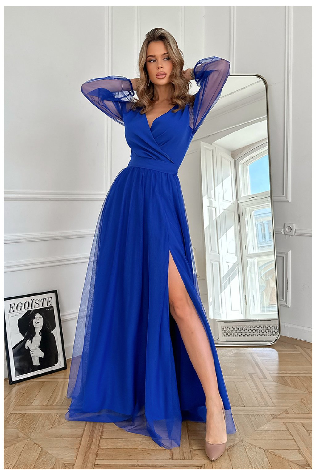 Krásné dlouhé šaty, neuvěřitelně elegantní, ušité z lehké látky. Horní část s jemným výstřihem, spodní část dvouvrstvá s prořezem na noze, dodávající kreaci půvabu. Šaty se zapínají na skrytý zip. K šatům je přiložen pás. K dispozici v módních barvách.Složení:
