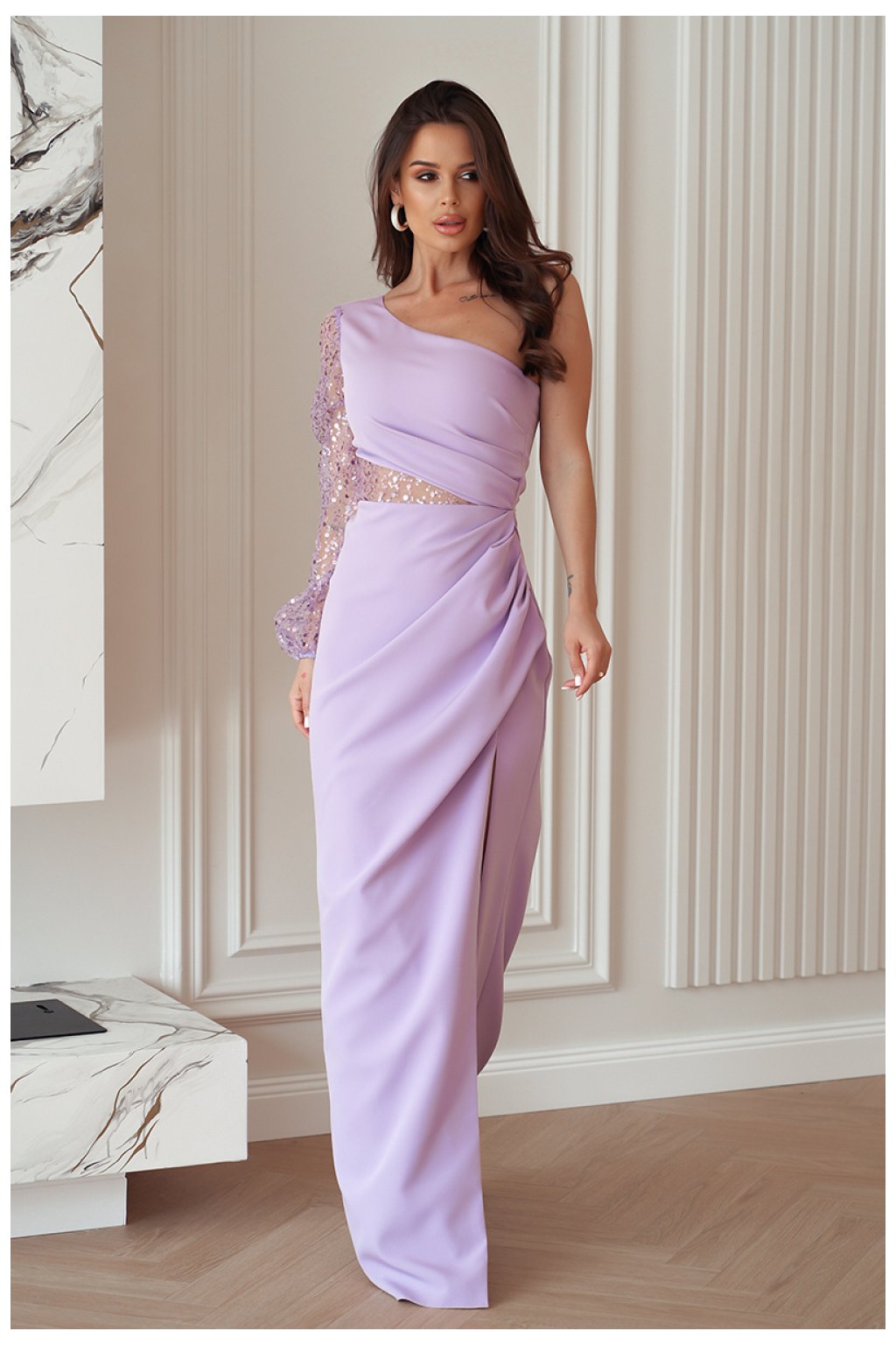 Model s krásným flitrovým rukávem na jedno rameno. Horní část asymetrická, také s flitrovým vložením. Spodek kreace hladký, zmačkaný, s efektním rozparkem na noze. Šaty se zapínají na skrytý zip, mají podšívku. Šaty jsou neuvěřitelně elegantní, stylové, ideální na plesy, maturitní plesy a svatby.Složení: