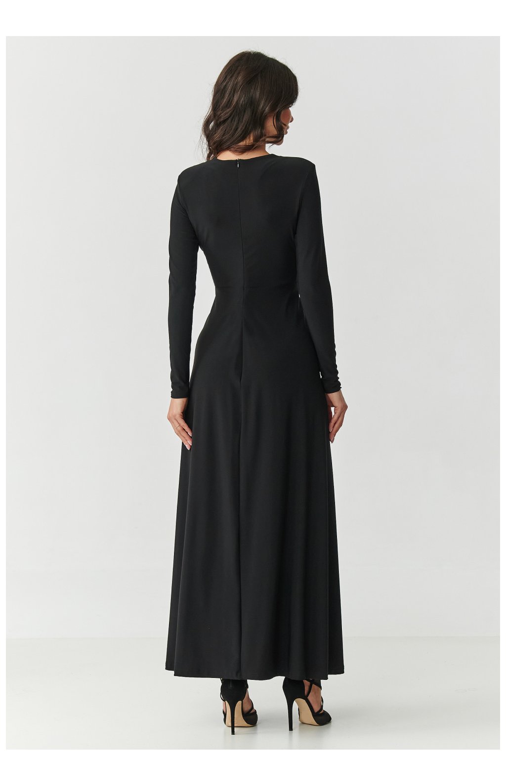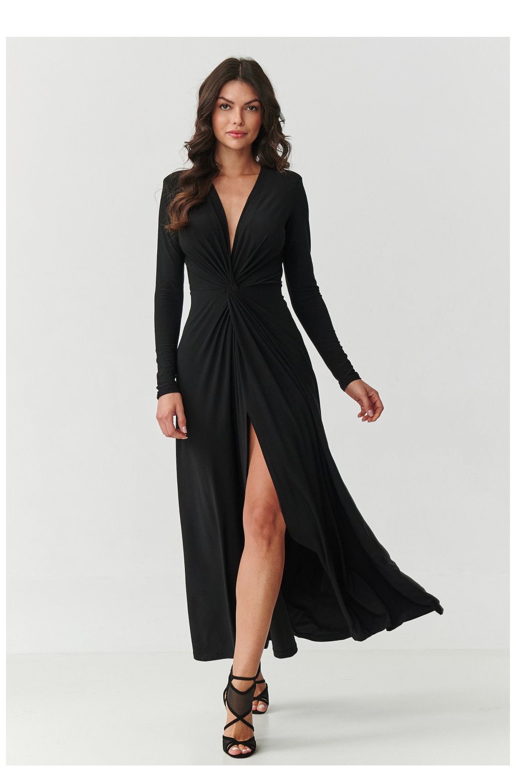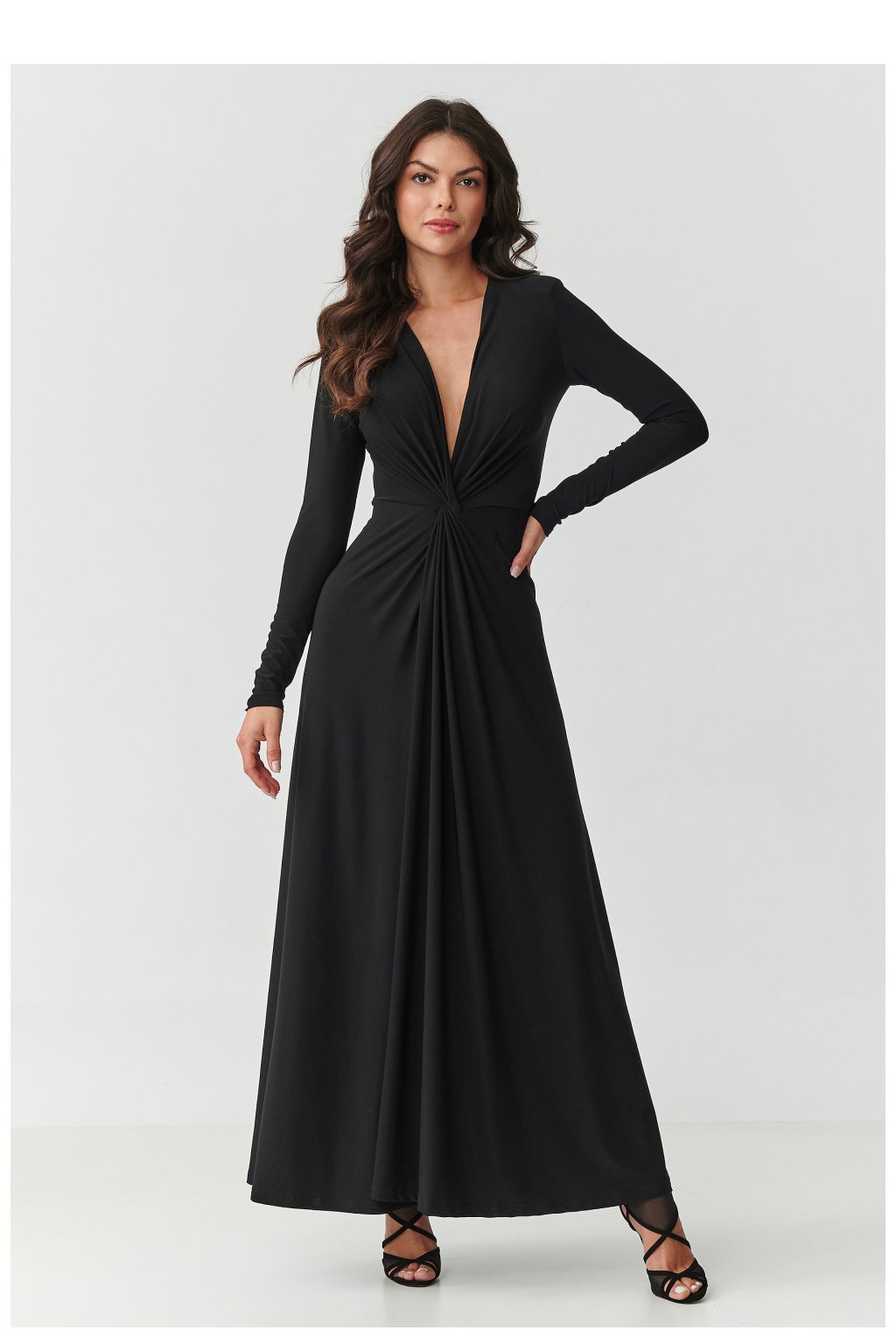 Oslněte elegancí a ženskostí v jedinečném maxi šatě s hlubokým výstřihem na srdce a jemným začínáním v pasu. Je to model, který krásně zdůrazňuje postavu, zároveň si zachovává třídu a lehkost. Dlouhé rukávy a tekutý, měkký materiál zajišťují, že šaty skvěle sedí a poskytují pohodlí po celý den. Tento dlouhý šaty jsou ideální volbou na speciální příležitosti svatba, svátky, večeři ve dvou nebo elegantní večírek. Začínání v pasu opticky zjemňuje postavu, a rozšířený spodek s rozparkem krásně padá při pohybu, vytvářející efekt WOW. K dispozici v černé barvě. Očarujte styl a sebejistotu v šatech, které spojují nadčasovou eleganci s moderním šarmem.