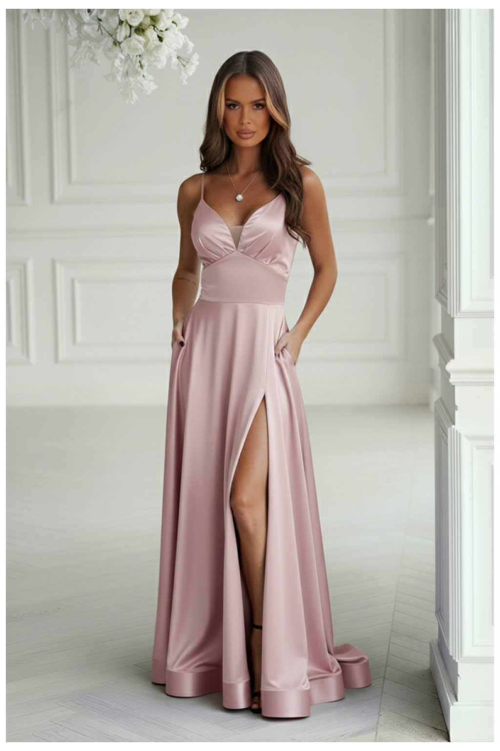 Šaty s akcentem plesové elegance a luxusu. Vyrobené z lesklého saténu, vyznačují se krásně urovným, širokým dnem, který dodává celku vznešený charakter. Smyslné korzetové šněrování na zádech zdůrazňuje pas. Šaty se zapínají na skrytý zip. Ideální na maturitní ples, svatbu a další speciální příležitosti.