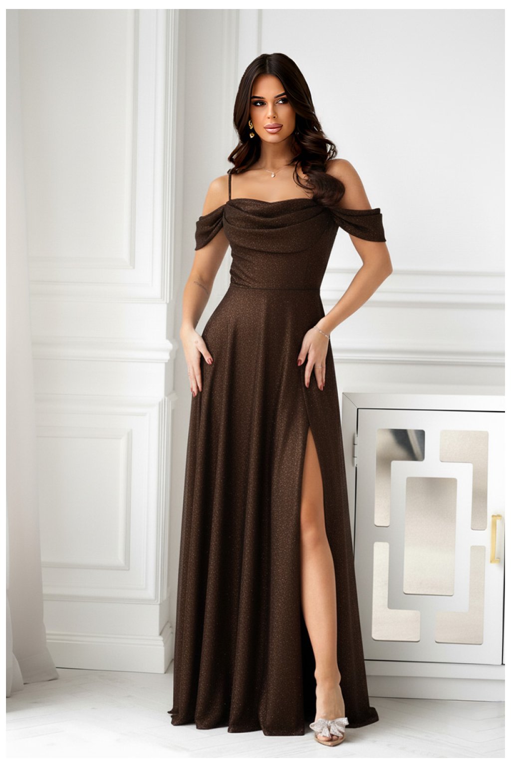 Přizpůsobený vrch zdůrazňuje pas a dlouhá, lehoučká sukně opticky zjemňuje postavu. Efektní rozpark dodává lehkost a volnost pohybu. Vyrobeno z měkkého, lesklého materiálu, který jemně třpytí při každém kroku. Šaty se zapínají na skrytý zip. Vrchní část šatů má podšívku, spodní část bez podšívky. Ideální na speciální příležitosti, spojuje eleganci a pohodlí.
