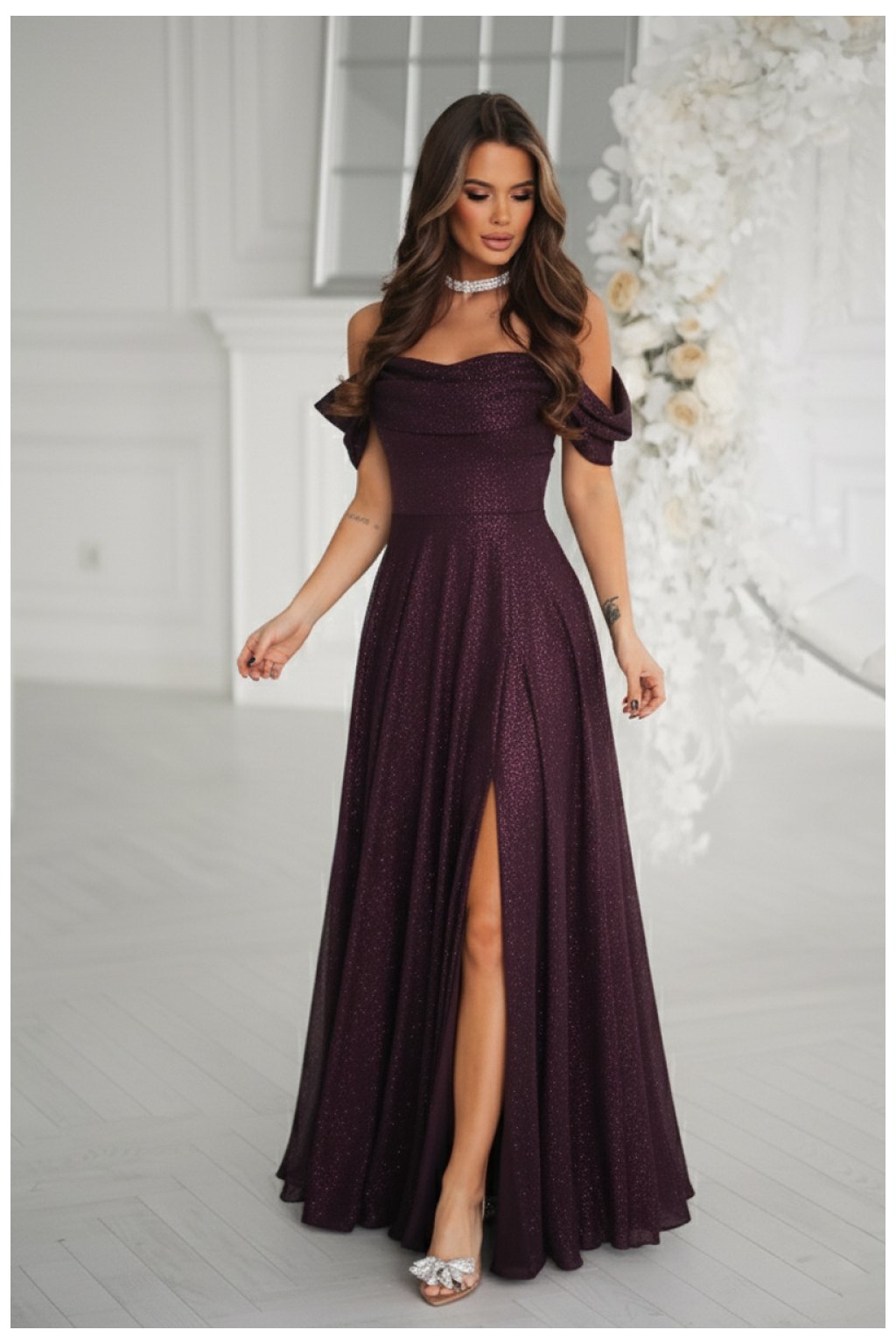 Přizpůsobený vrch zdůrazňuje pas a dlouhá, lehce vlnící se sukně opticky zúžuje postavu. Efektní rozpark dodává lehkost a volnost pohybu. Vyrobeno z měkkého, lesklého materiálu, který jemně září každým krokem. Šaty se zapínají na skrytý zip. Vrchní část šatů je podsaditá, spodní část bez podsívky. Ideální na speciální příležitosti, kombinuje eleganci a pohodlí.