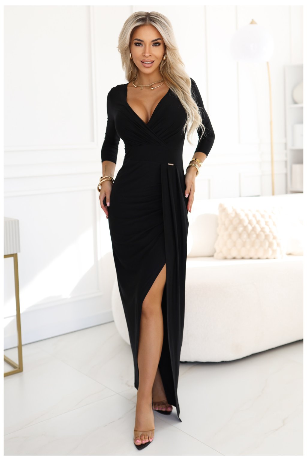 Časově elegantní v polském provedení. Existují šaty, které nikdy nevyjdou z módy. Tato černá maxi s hlubokým přesýpacím výstřihem a 3/4 rukávem je právě takovou kreací. Přiléhavý vrch, strategicky umístěné rozeknutí a klasická černá barva vytvářejí kompozici, která funguje vždy a všude. Vyrobeno z vysoce kvalitní elastické pleteniny, která se krásně přizpůsobuje postavě a nehne se při nošení. Přesýpací výstřih s drapováním opticky zúží a zdůrazní poprsí, zatímco 3/4 rukáv je ideální délka na každé roční období. Rozeknutí umístěné po straně odhaluje nohu při chůzi, přidávajíce celkovému vzhledu ženský charakter. Elegantní dlouhé šaty značky Numoco v černé barvě. Smyslný přesýpací výstřih, přiléhavý střih a efektní rozeknutí na noze zdůrazňují ženskou postavu. Ideální na večerní výlety, oslavy a speciální příležitosti. Polský produkt.