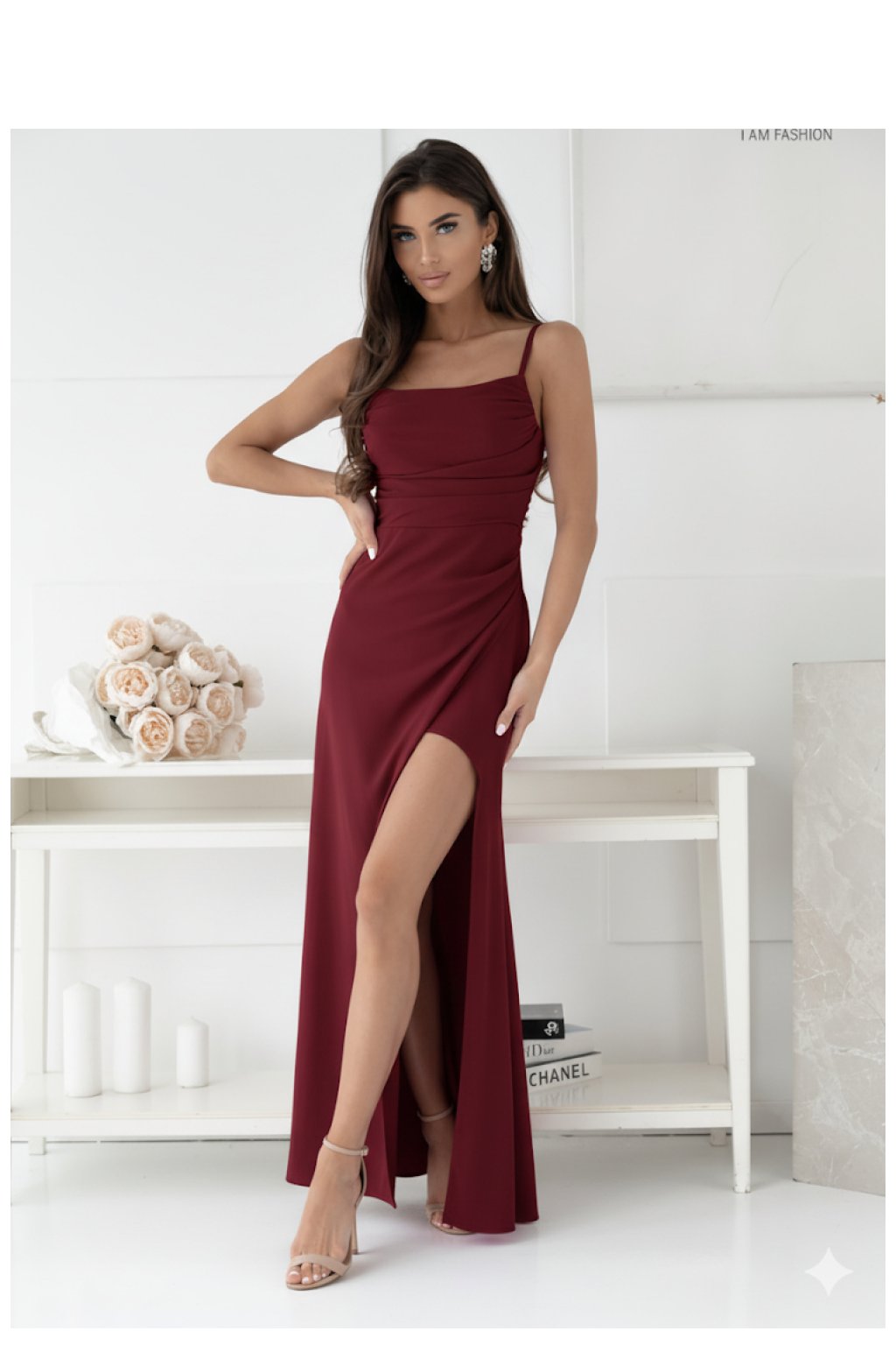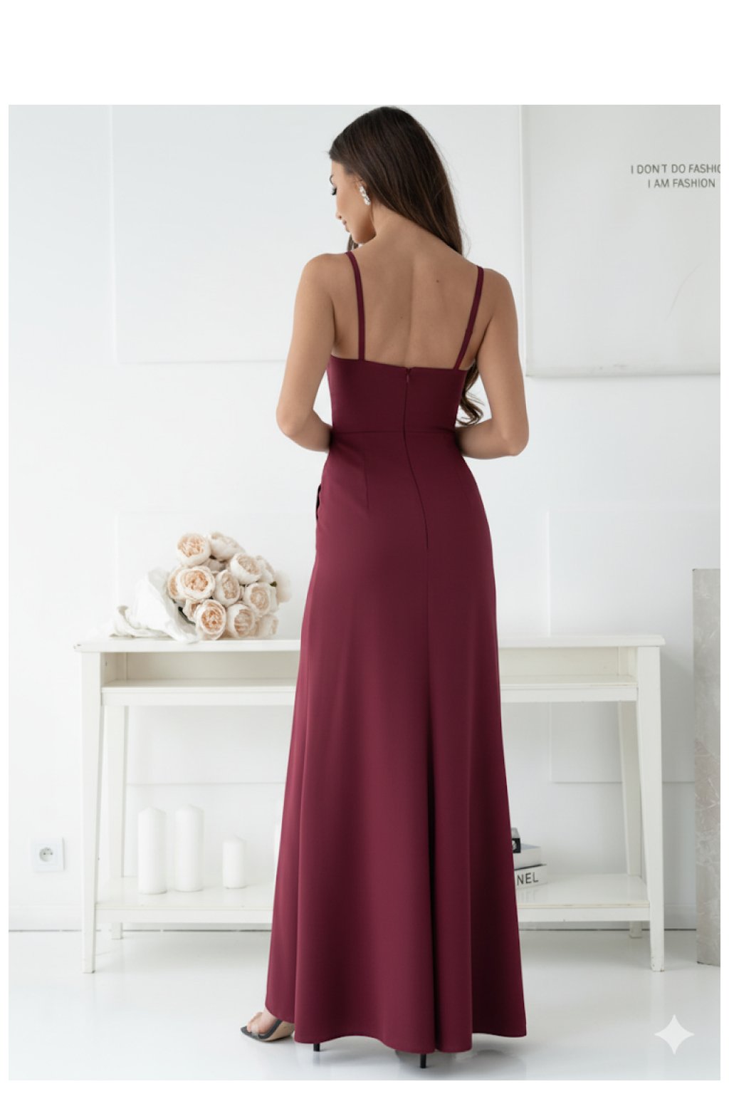 Smyslné a elegantní šaty maxi délky, zapínající se vzadu na skrytý zip, který jemně zdůrazňuje linii zad. Model má tenká ramínka, která vystavují ramena a výstřih, a drapování na přední straně, které přidávají lehkost a jemně modelují postavu. Spodek šatů má záhyb, krásně vystavující nohu při každém kroku, což dodává celku mimořádně ženský charakter. Vyrobeno z měkkého, lehce elastického materiálu, skvěle padne na tělo a poskytuje pohodlí nošení. Ideální volba na večerní výlety, elegantní večírky nebo romantické večeře.