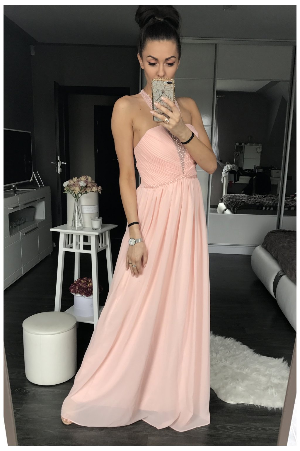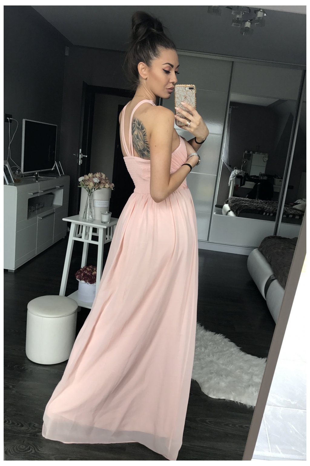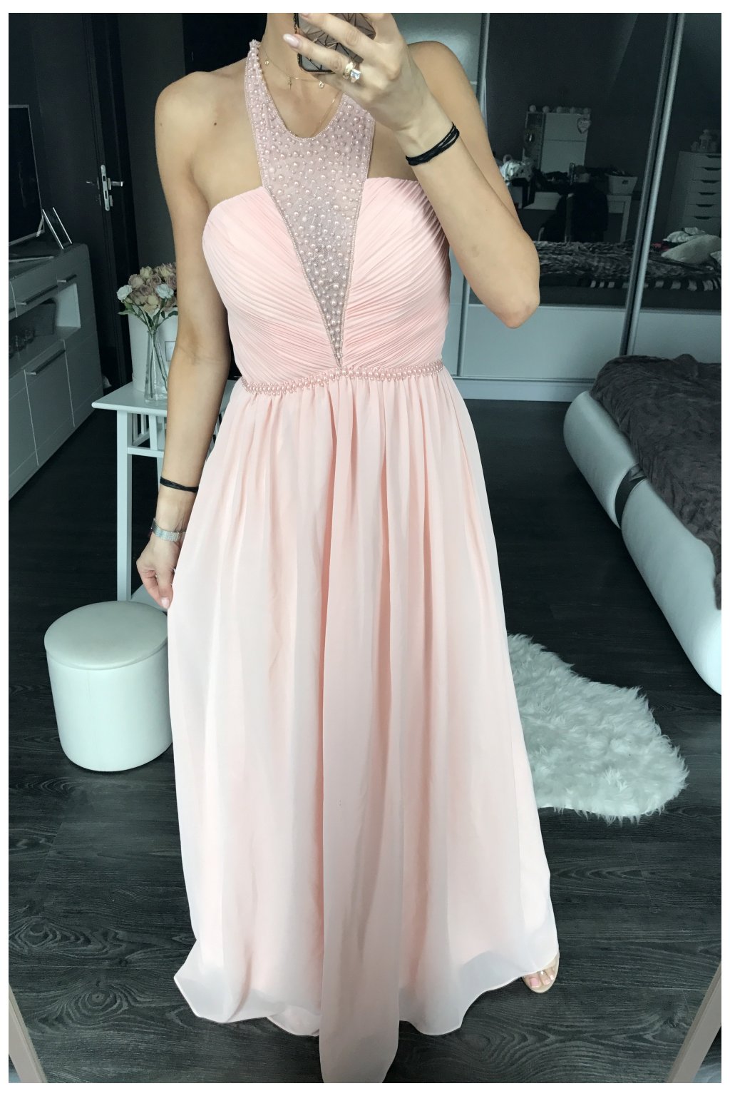 Dlouhé rovné šaty bez rukávů. Přiléhavý top zdobený perlami. Šaty se zapínají na krytý zip na boku. Volný, zeštíhlený spodní díl. Ideální na večer.