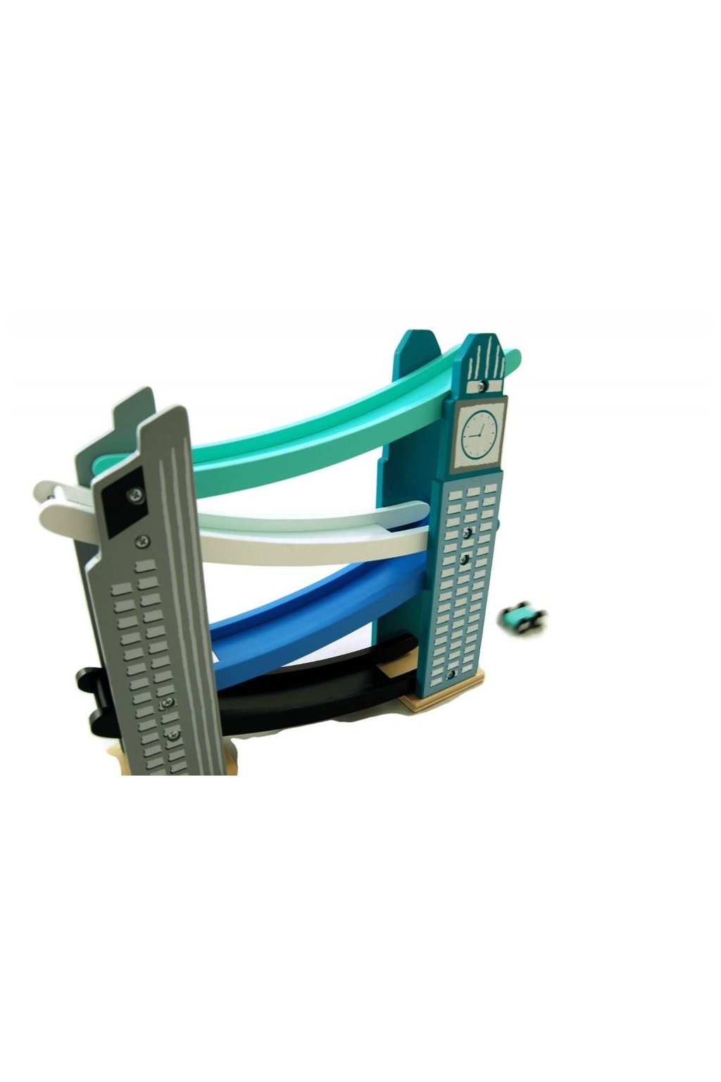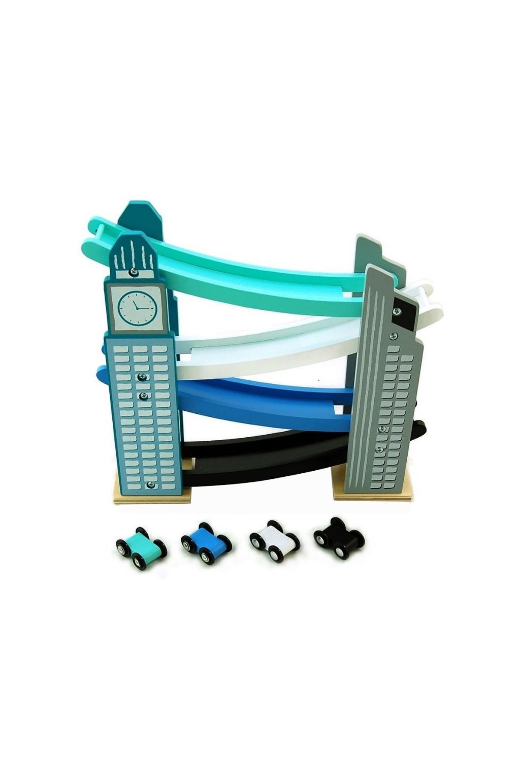 Dřevěná dráha klouzačka s autíčky. Pestrobarevná závodní dráha ze dřeva, kde autíčka sjíždí jednotlivé patra až dojedou do cíle. Součástí balení jsou 4 barevná autíčka. Vhodné pro děti od 18 měsíců. Rozměry: 30 x 29 x 8cm. 1. Jakost.Doplňkové parametry