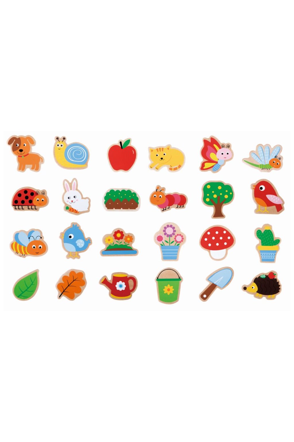Dřevěné magnetky. Rozvíjí jemnou motoriku, koncentraci a logiku Vašeho dítěte. Edukační hračka díky, které se děti naučí i barvy. Tato sada obsahuje 24 dřevěných magnetků znázorňujících zahrádku. Určená pro děti od 3 let. Rozměry: balení: 21 x 17 x 4 cm, magnetky: 6 x 3,5cm. Atest CE - bezpečná hračka. Vyrobena v EU. 1. Jakost.Doplňkové parametry