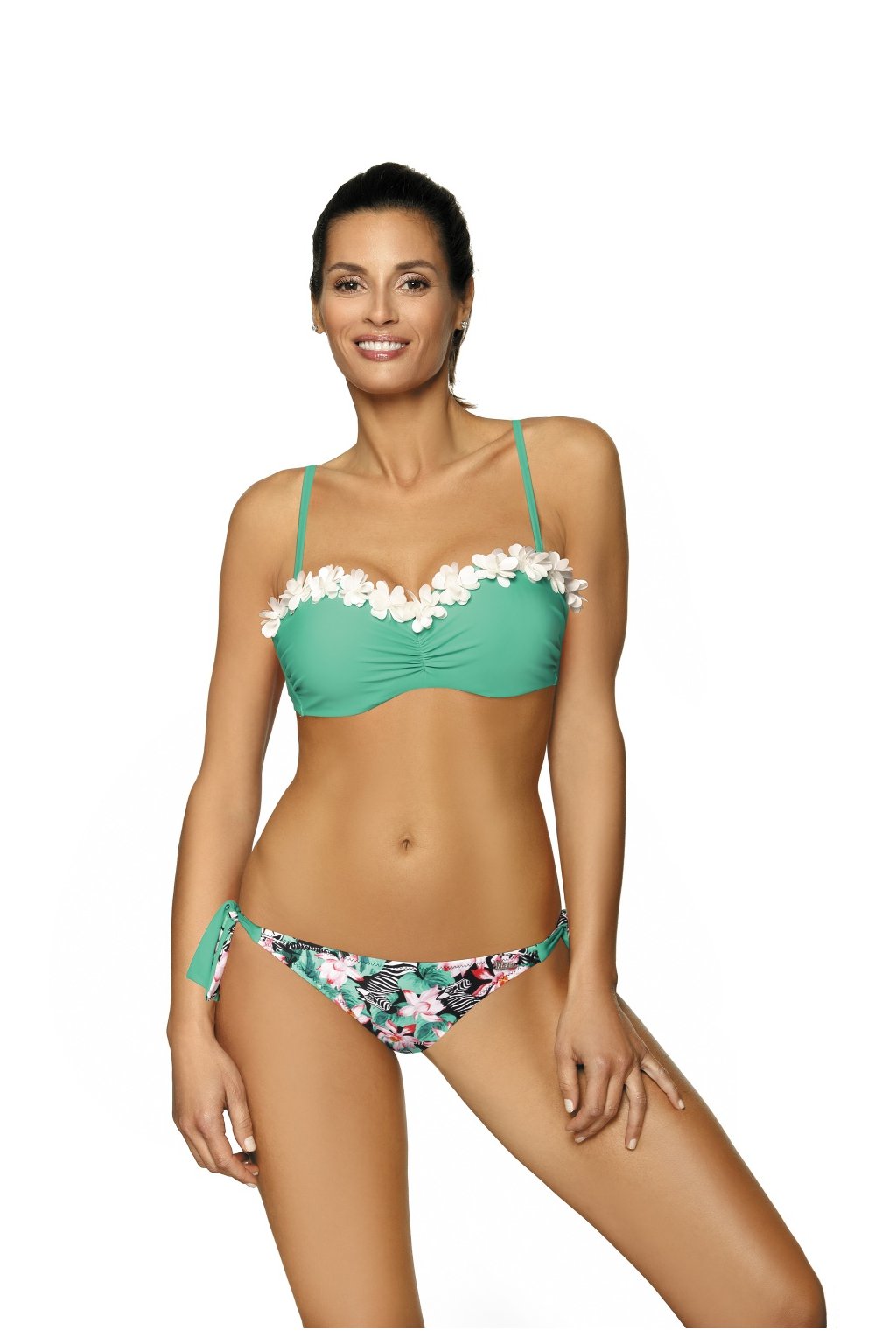 Dvoudílné plavky s květinovým lemováním podél výstřihu. Vypadá romanticky, luxusně a velmi sexy. Návrh pro dámy, které sní o velkých, pevných a sexy prsou, krásně nabraných ve výstřihu. Podprsenka se vyznačuje skvělou konstrukcí, která je určena pro menší a střední prsa - je vyztužená a má poměrně velkou push-up výplň, která je v podprsence trvale umístěna. Umožňuje efektní vypnutí prsou, jejich modelaci a optické zvětšení, které je vidět na obrázku. Použití květinového, jemného lemování v horní části navíc upozorňuje na krásně modelovaný výstřih. Nastavitelná, odnímatelná ramínka, ideální na opalování. Vazby obvodů na zadní straně. Kalhotky jsou vzorované, na bocích zavázané brazyliany. Pro dosažení plného efektu je pevně vytáhněte nahoru, aby jejich trojúhelníkový tvar pěkně zdobil spodní část, která částečně přesahuje obrys kalhotek.