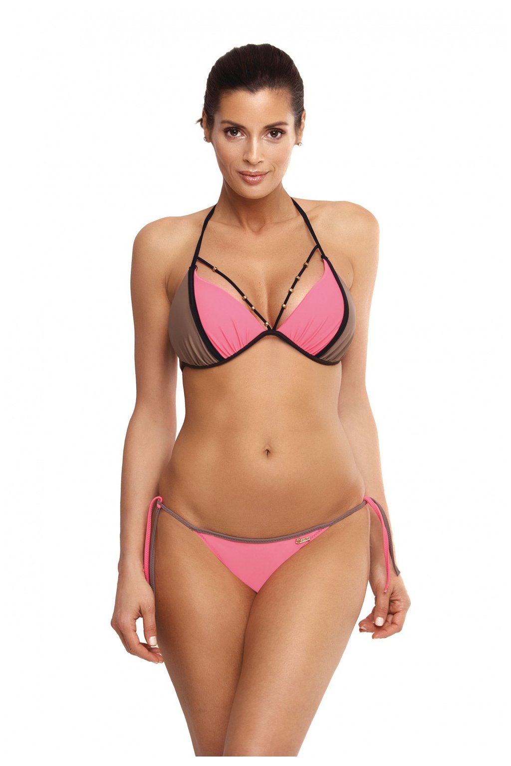 Návrh pro milovníky barevných fenomenálních dvoudílných plavek v bikinovém střihu. Vázání za krkem, na zádech a po stranách boků. Sexy a velmi ženské. Hladké košíčky s kontrastním černým lemováním jsou vyztužené, bez push-up, dobře sbírají a zpevňují prsa a zároveň je přibližují k sobě. Výstřih je doplněn dvěma ozdobnými pásky zakončenými drobnými šperky. Svůdné kalhotky s nízkým sedem jsou velmi ženskou volbou na pláž. Italská tkanina.