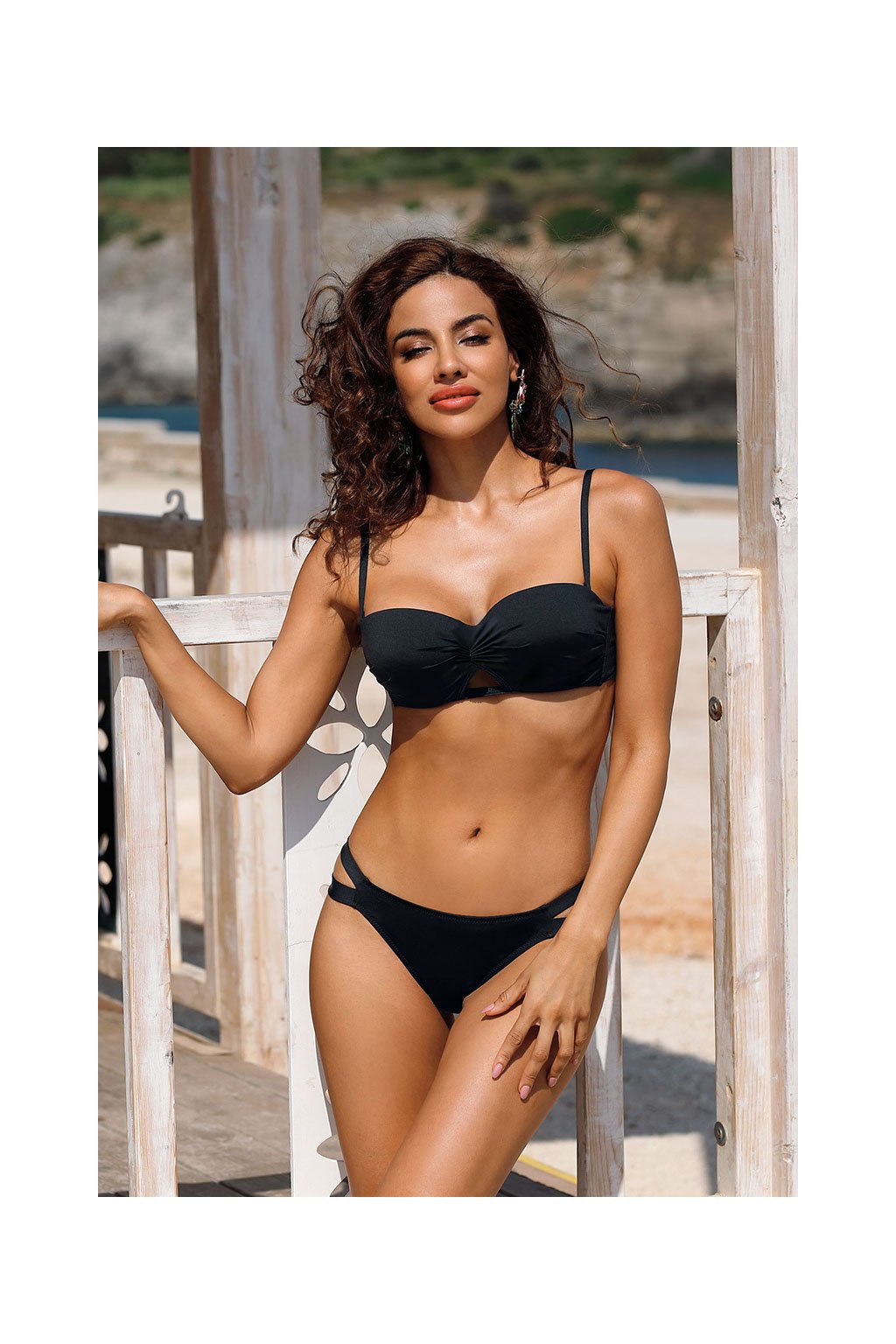 Podprsenka má střih bardot, vyztužené košíčky s kosticemi a vestavěný, tvarovaný push-up. Zavazuje se na zádech. Ramínka jsou nastavitelná a odnímatelná. Spodní část je vzadu nařasená a na bocích má pogumované pásky.