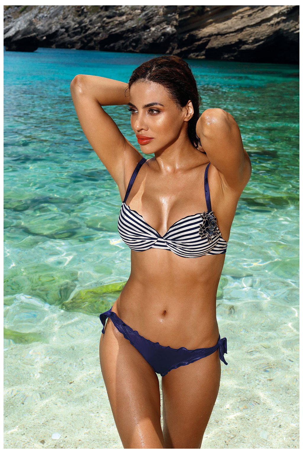Třpytivé dámské plavky ve vždy módním námořnickém designu. Pohodlná podprsenka bardotka s vodorovnými ramínky. Dvoudílné plavky s vyztuženými košíčky a speciálními vložkami PUSH-UP, které zvětšují a dodávají prsům přirozený, smyslný vzhled. Zaoblují se, stahují dovnitř a zvedají, čímž vytvářejí efekt pevného, velkého poprsí. Podprsenka s pohodlnými, nastavitelnými ramínky a rychlým zapínáním na zádech. Krásná vyšívaná květinová ozdoba na levém košíčku. Souprava je dodávána s jednobarevnou spodní částí, podprsenkou nižšího střihu, na okrajích mírně nařasenou a zavazovanou na bocích. Plážové oblečení, které zdůrazní přednosti vaší postavy a sexy je odhalí.