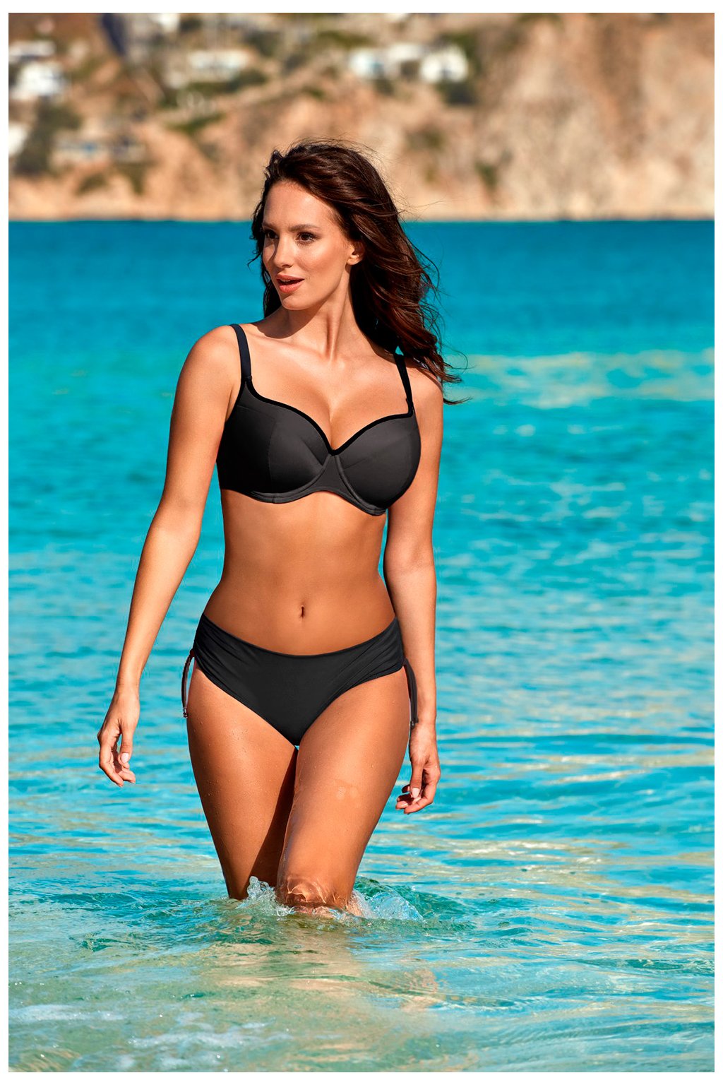Dvoudílné plavky z italské tkaniny Carvico Tessuti. Podprsenka bez push-up, vyztužené košíčky vytvářejí efekt pevného, velkého smyslného poprsí. Podšité kalhotky, hladké s pohodlným střihem, zavazování na bocích.