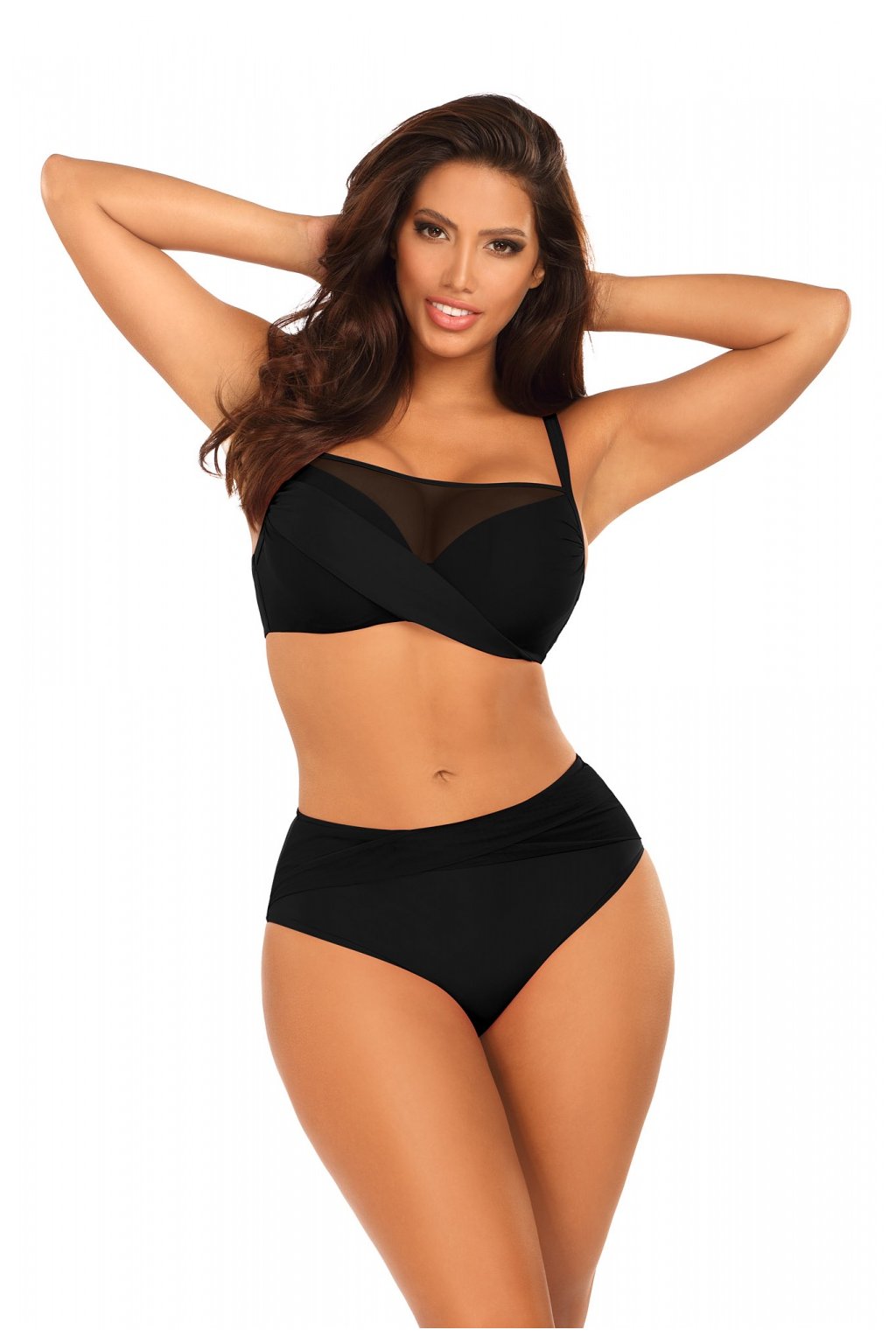 Módní a mimořádně elegantní dvoudílné plavky od renomovaného výrobce. Model zaujme dokonalým zpracováním. Krásně se prezentuje i naživo. Plavky jsou zdobené síťovinou. Podprsenka bardotka s kosticemi má vyztužené tepelně tvarované košíčky (vložky nejsou vyjímatelné) a přídavné boční velrybí kostice. Nádherně tvaruje a pozvedá poprsí. Podprsenka se vzadu zapíná na kovovou sponu. Mezi košíčky je logo výrobce. Ramínka bez ramínek nastavitelná a vzadu odnímatelná. Kalhotky v sadě jsou pěkně střižené plné kalhotky s mírně vyšším sedem. Plavky jsou z vnitřní strany pokryté jemnou podšívkou, díky níž se můžete cítit pohodlně, protože plavky neprosvítají. Vyladěná konstrukce modelu se dokonale přizpůsobuje siluetě. Vysoce kvalitní materiál, rychleschnoucí, odolný vůči chlóru a slunečnímu záření. Ideální model do bazénu i na pláž.