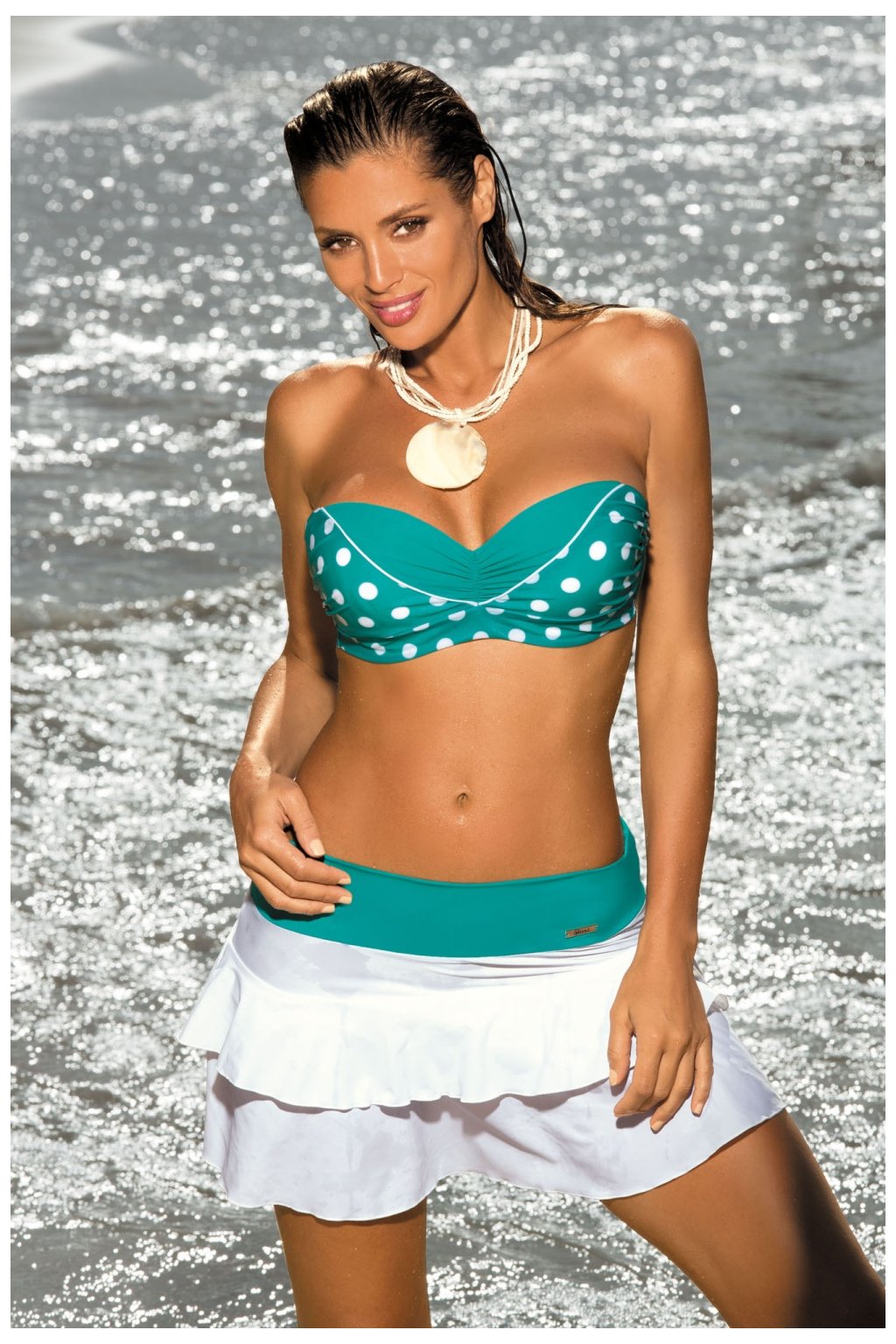 Velký, tuto sezónu módní hrášek v chladném barevném provedení. To je perfektní nápad na pláž. Plavky mají sexy a velmi pohodlnou podprsenku se vzorem bardot. Horizontální linie střihu umožňuje dosáhnout smyslného vzhledu a maximální elegance. Vyztužené košíčky obohacené o podšívku (horizontální a vertikální), doplněné kapsičkami pro přiložené push-up košíčky (k dispozici ve velikostech S, M, L, XL) - vložte je do podprsenky a vaše prsa se opticky zvětší o více než jednu velikost. Konstrukce navíc umožňuje dokonale zvednout prsa a přiblížit je k sobě. Na zádech se podprsenka zapíná na přezku. Nastavitelná délka popruhů s možností jejich úplného odepnutí.Složení: Materiál: 80 % polyamid, 20 % elastan.