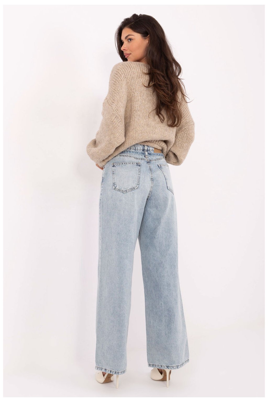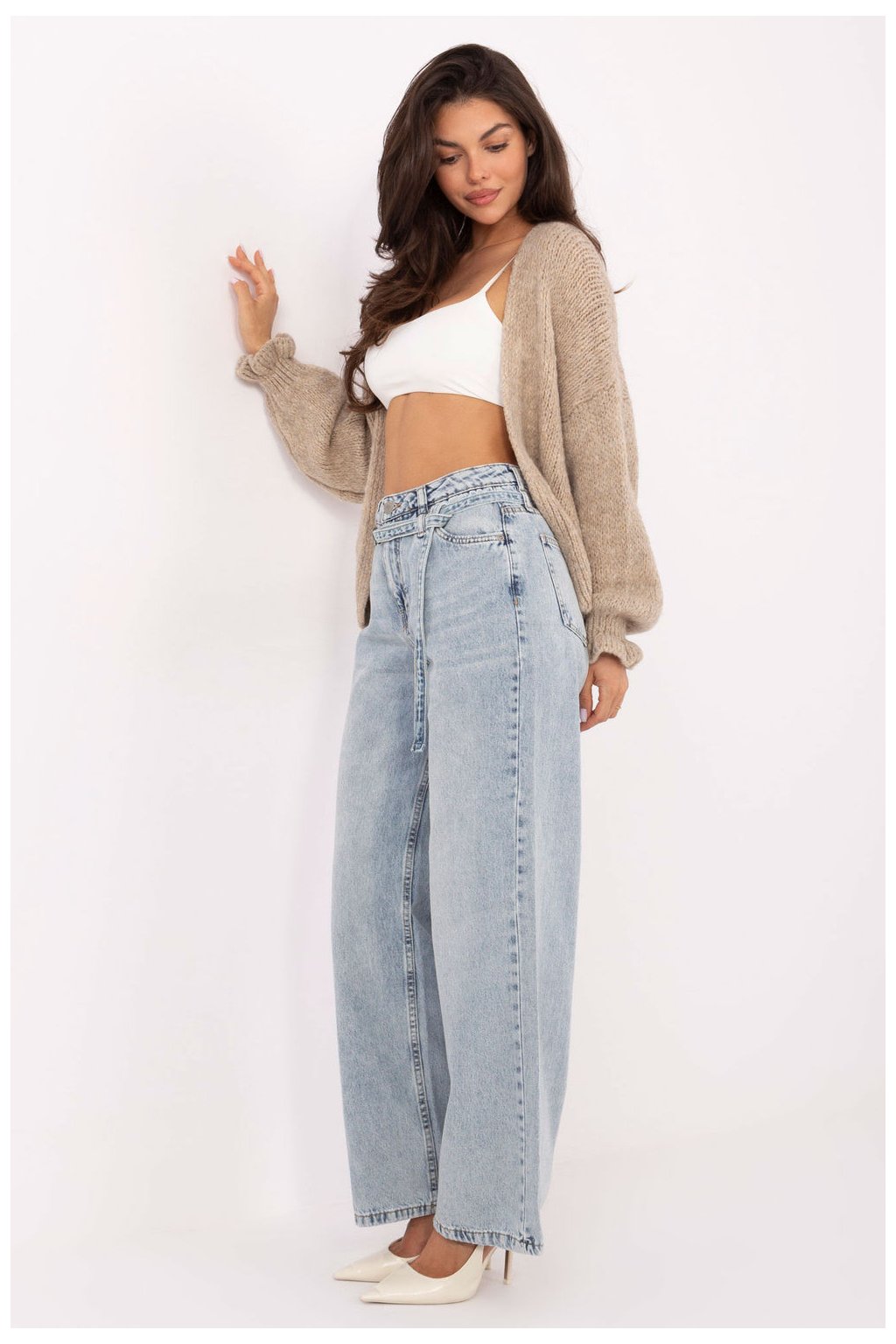 Dámské džíny s širokými nohavicemi v casual stylu, ideální na každodenní outfity. Vyrobené z vysoce kvalitní bavlny, poskytují pohodlí a volnost pohybu. Model s vysokým pasem a širokými nohavicemi krásně zdůrazňuje pas a prodlužuje postavu. Na přední straně jsou praktické kapsy, vzadu klasické otevřené kapsy. Celkový vzhled doplňuje pásek ze stejného materiálu, který dává kalhotám souvislý a stylový charakter. Zapínání na zip a knoflík.