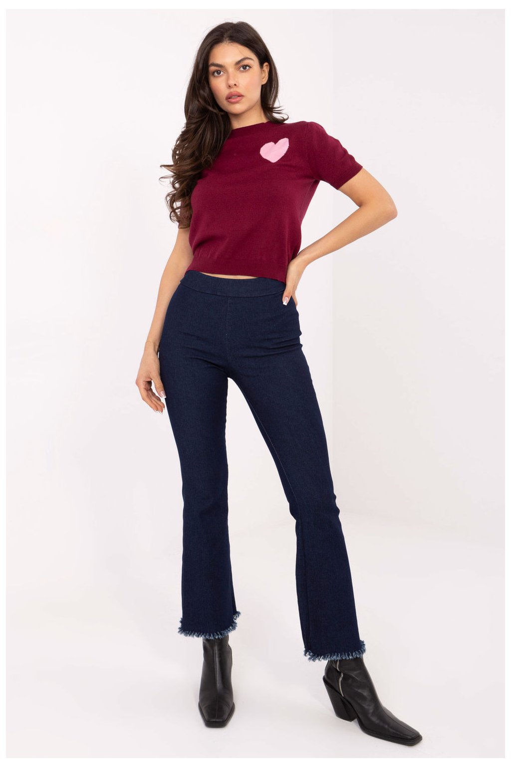 Moderní a pohodlné dámské dzínové kalhoty s efektním dokončením, s roztrhanými nohavicemi dole, které dodávají outfitu lehce rockový, casualový charakter. Vyrobené z odolné a elastické směsi bavlny, polyesteru a elastanu, poskytují pohodlí nošení a volnost pohybu po celý den. Model má vysoký pas s všitou gumou v pase, co zaručuje ideální přizpůsobení postavě a pohodlí, a široké nohavice typu zvon o opticky prodlužují nohy a vytvářejí módní, uvolněný vzhled. Kalhoty mají hladký vzor materiálu, chybí klasické zapínání a kapsy, co zdůrazňuje minimalistický, moderní charakter. Je to ideální volba na každodenní, casualové outfit, který spojuje pohodlí s výrazným, moderním designem.