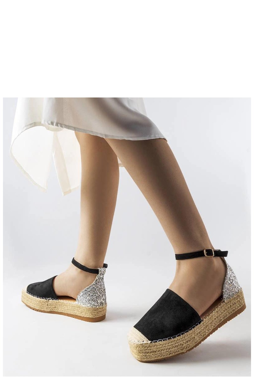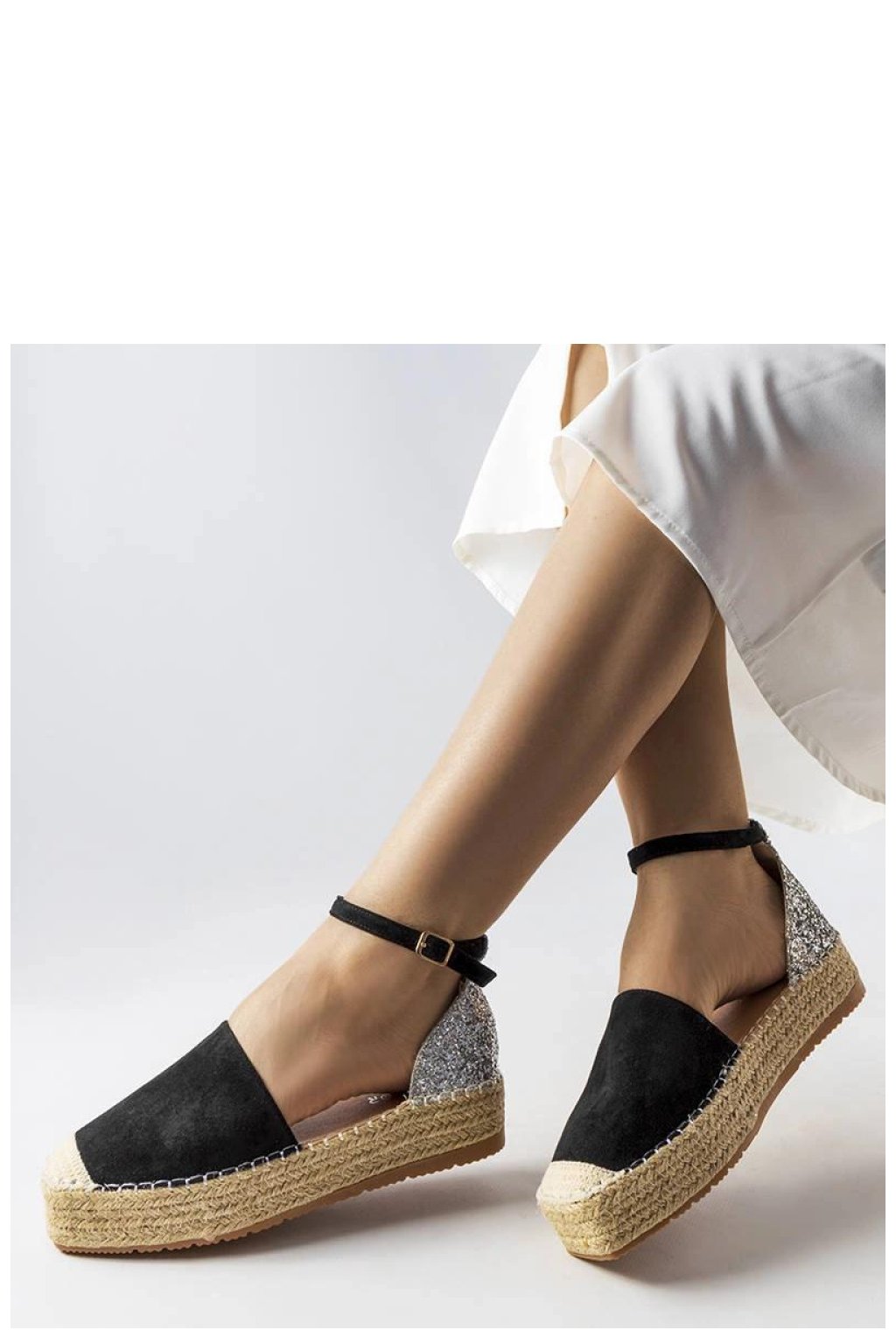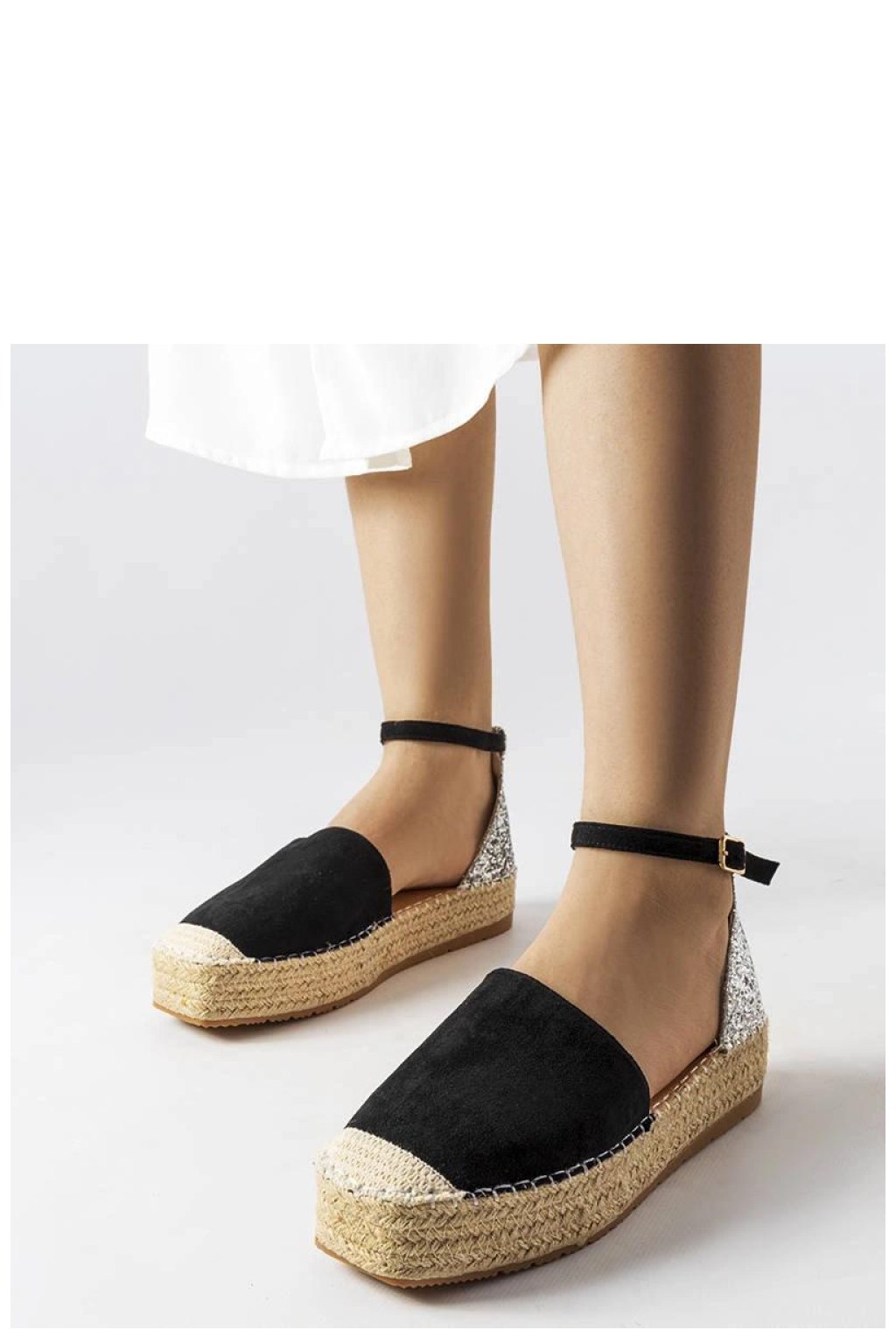 Černé espadrilky s brokatovým prvkem Myasia jsou ideální obuví na léto. Vyrobené z vysoce kvalitní ekologické kůže s přídavkem brokatové látky, která jim dodává eleganci a originalitu. Mají nízkou výšku, co z nich dělá velmi pohodlné na nošení. Nemají žádnou podšívku, co z nich činí ideální volbou na teplé dny. Podrážka z beige gumy zajišťuje dobrý úchop na povrchu. Zapínání na sponu umožňuje snadné přizpůsobení boty noze. Espadrilky Myasia jsou skvělou volbou pro ženy, které si cení pohodlí a módní vzhled. Ideální na letní procházky nebo setkání s přáteli.