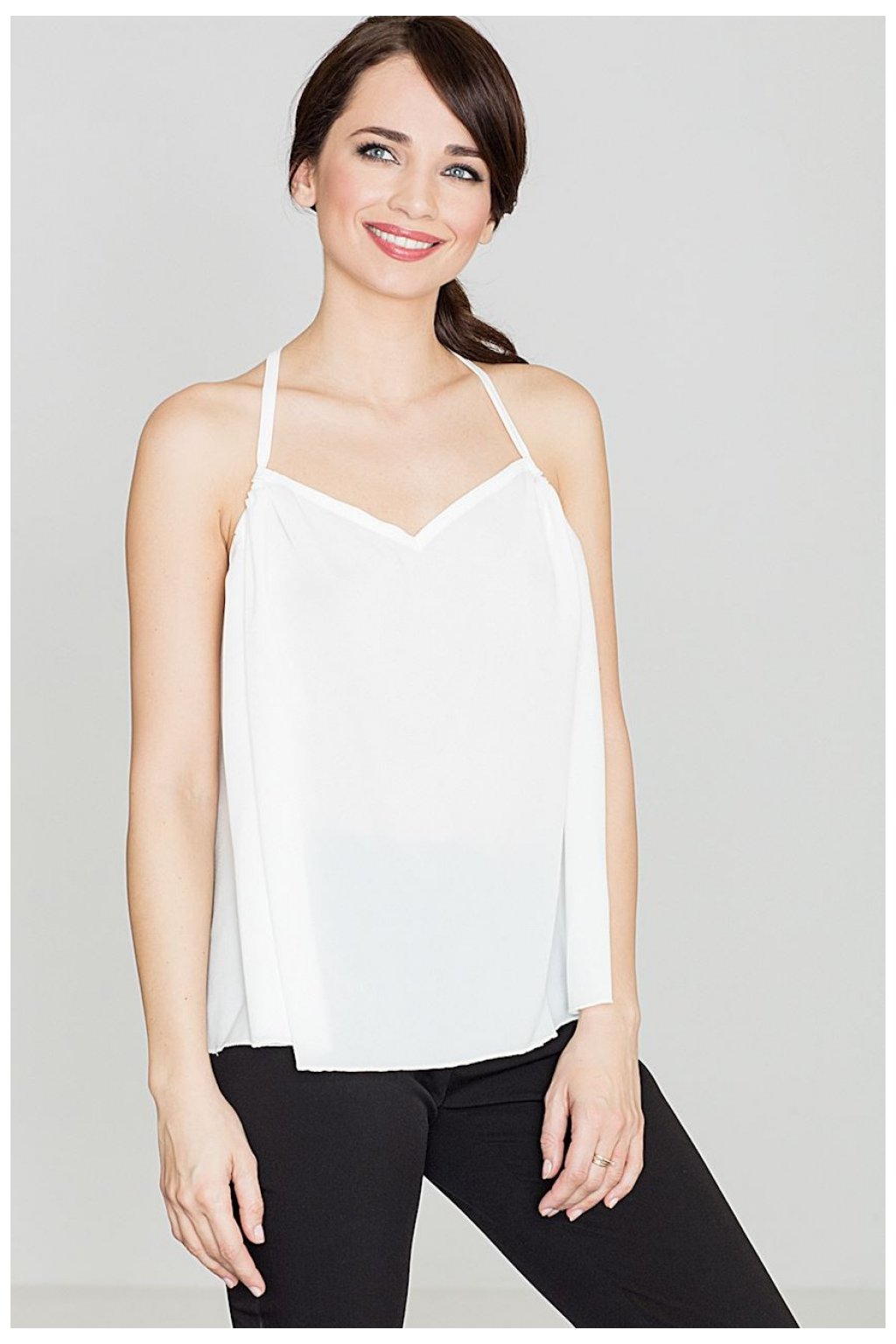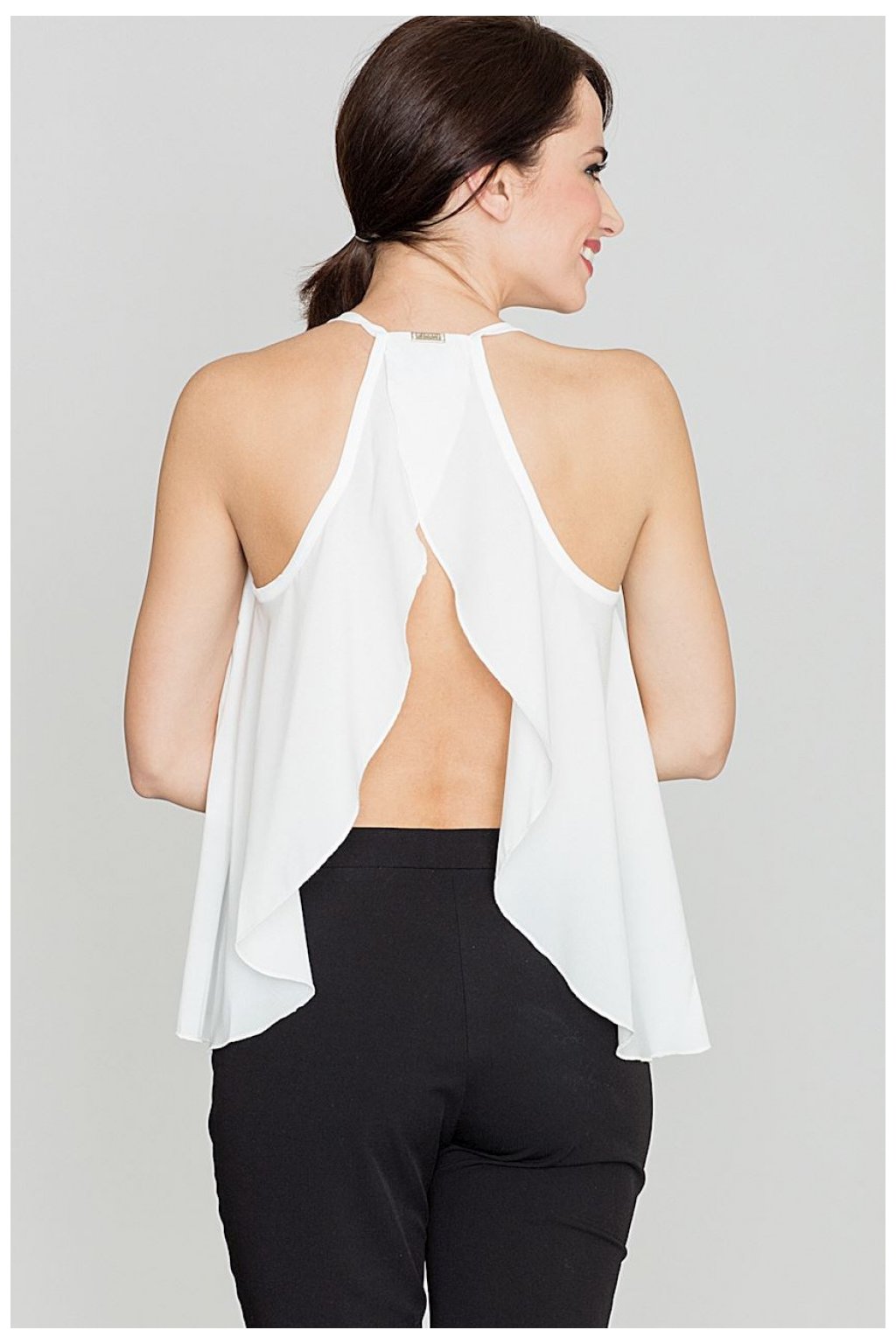 Volná letní halenka odhalující záda, s volánkem na zádech, řasení na úrovni prsou.