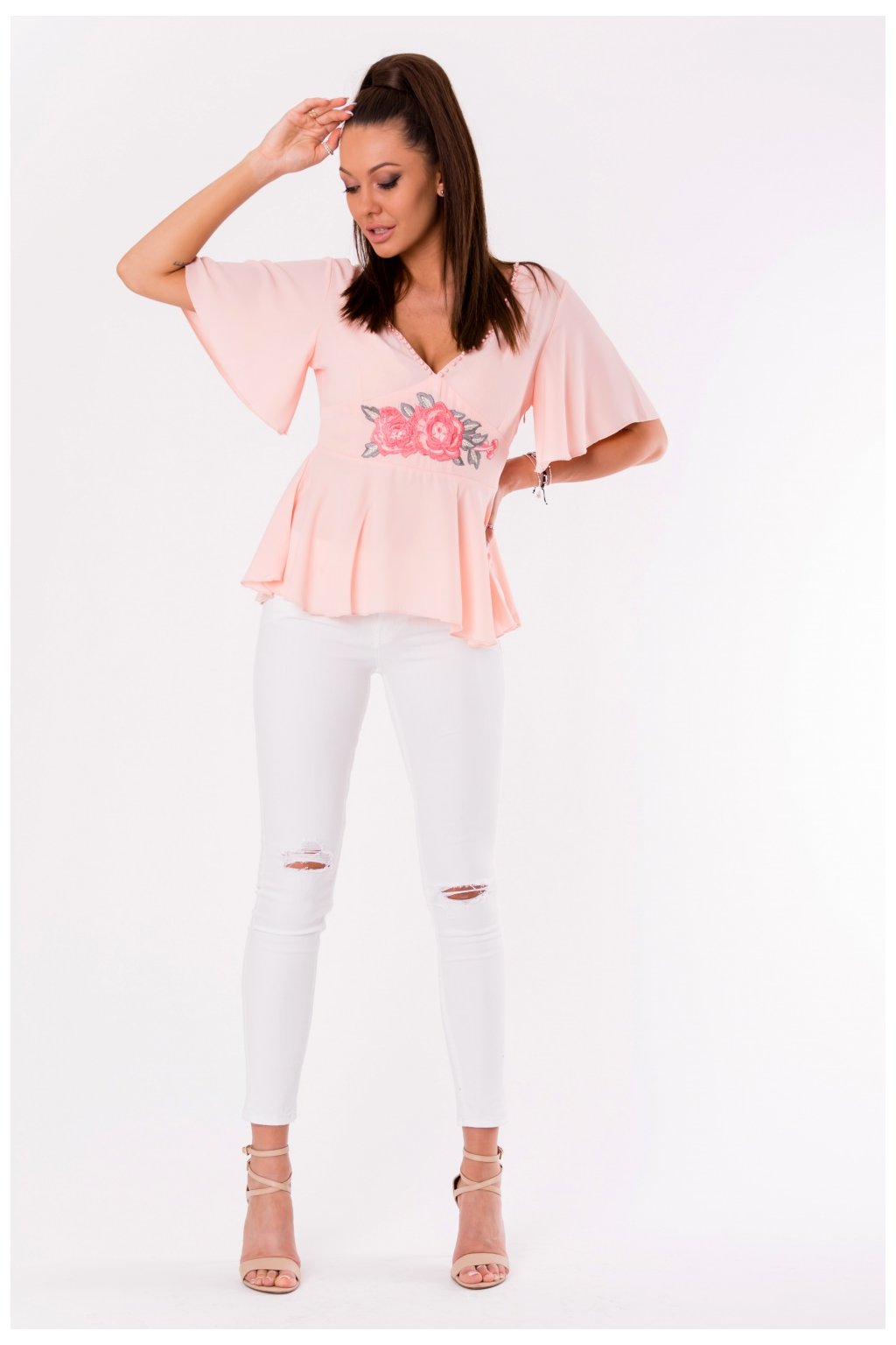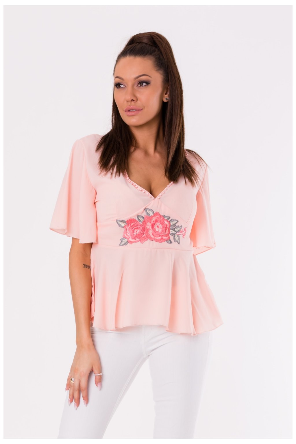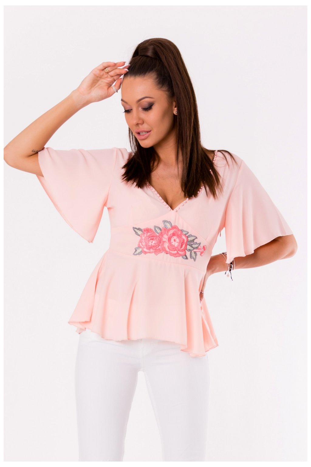 Vzdušná halenka s růží. Halenka má hluboký výstřih a volné rukávy.