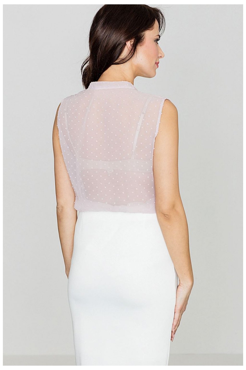 Halenka z jemné, módně průhledné látky v pastelových odstínech. Model se serekovým výstřihem zakončeným šerpou na zavazování, zapíná se na knoflíky. Halenka bez rukávů se širokými ramínky, která zakrývají horní část paží.