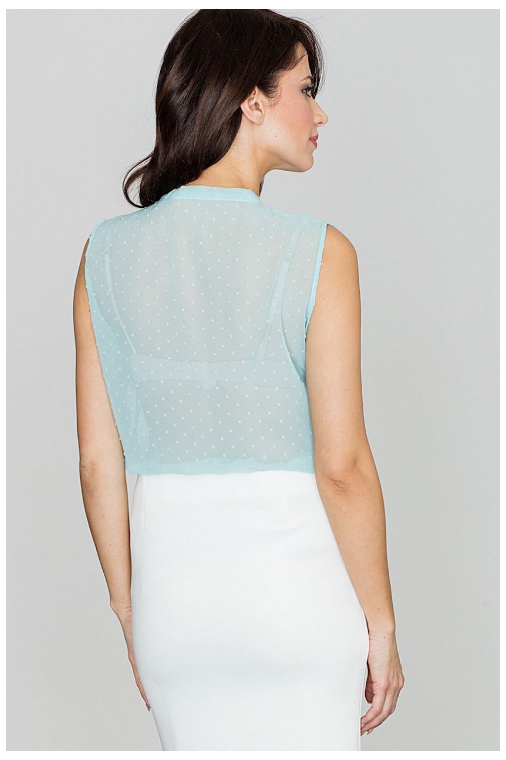 Halenka z jemné, módně průhledné látky v pastelových odstínech. Model se serekovým výstřihem zakončeným šerpou na zavazování, zapíná se na knoflíky. Halenka bez rukávů se širokými ramínky, která zakrývají horní část paží.